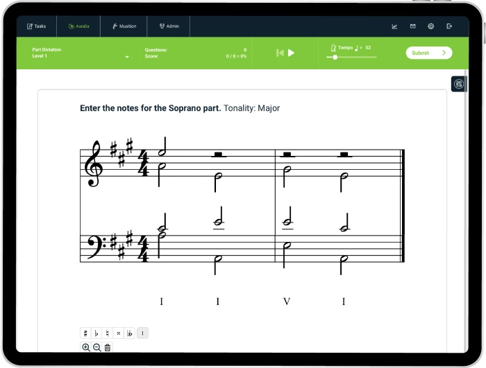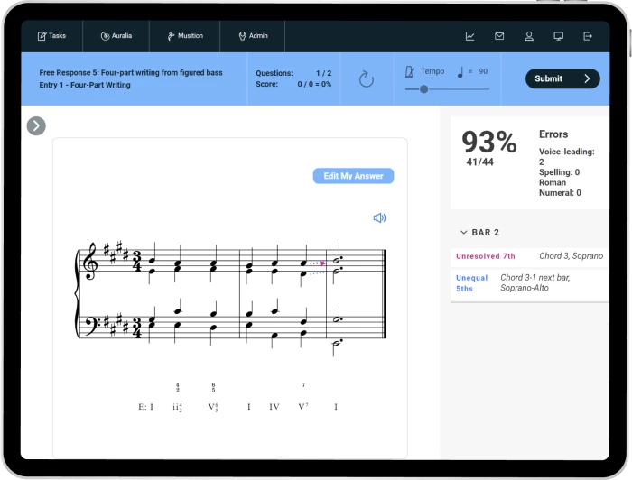 Easily add your own progressions in the Library and create a variety of different four-part writing question types based on your pedagogical needs.