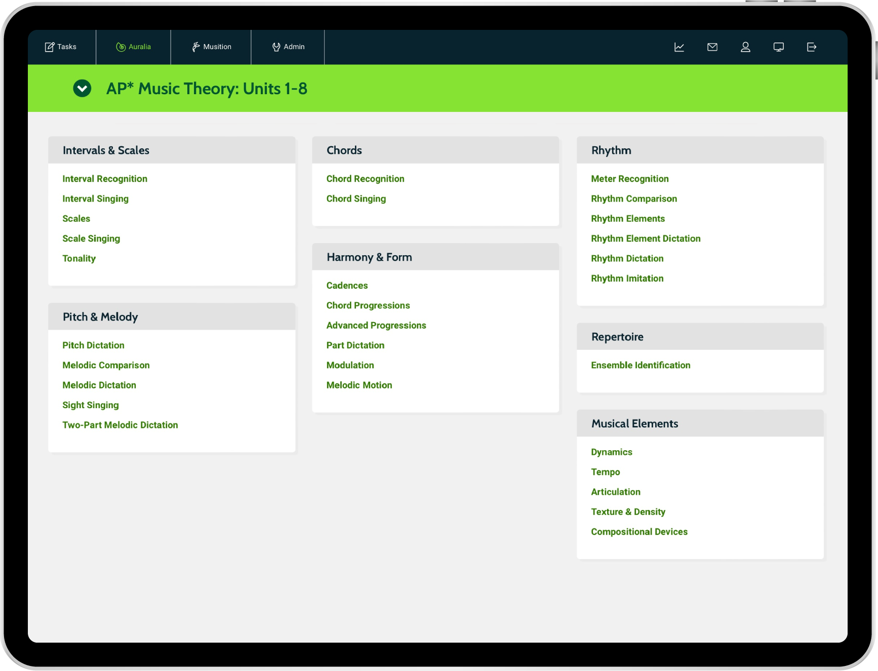 Auralia® & Musition® provide AP* Music Theory exam support materials mapped to the CED.