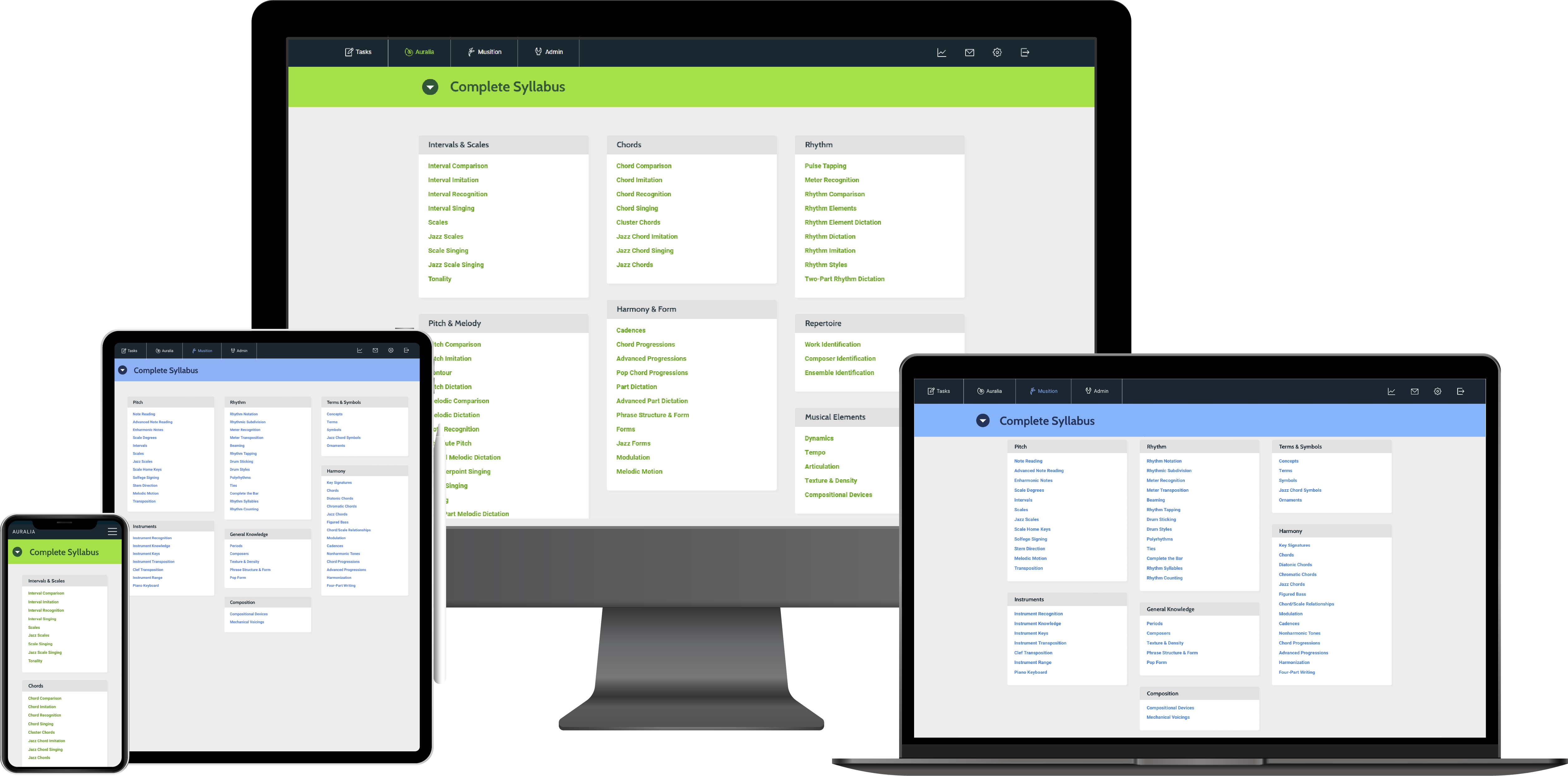 Auralia has 59 ear training topics, each with carefully sequenced levels that gradually introduce students to more difficult content. This approach allows you to use Auralia with beginners and advanced students, with each student learning at their own pace.