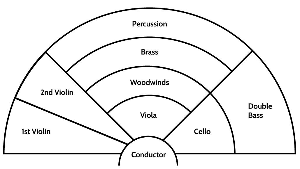 Strings: Positioned in the front of the orchestra. The first and second violins are typically on the left side, followed by the violas, cellos, and double basses, which are often on the right side. The harp is usually placed to the side of the strings, near the percussion.