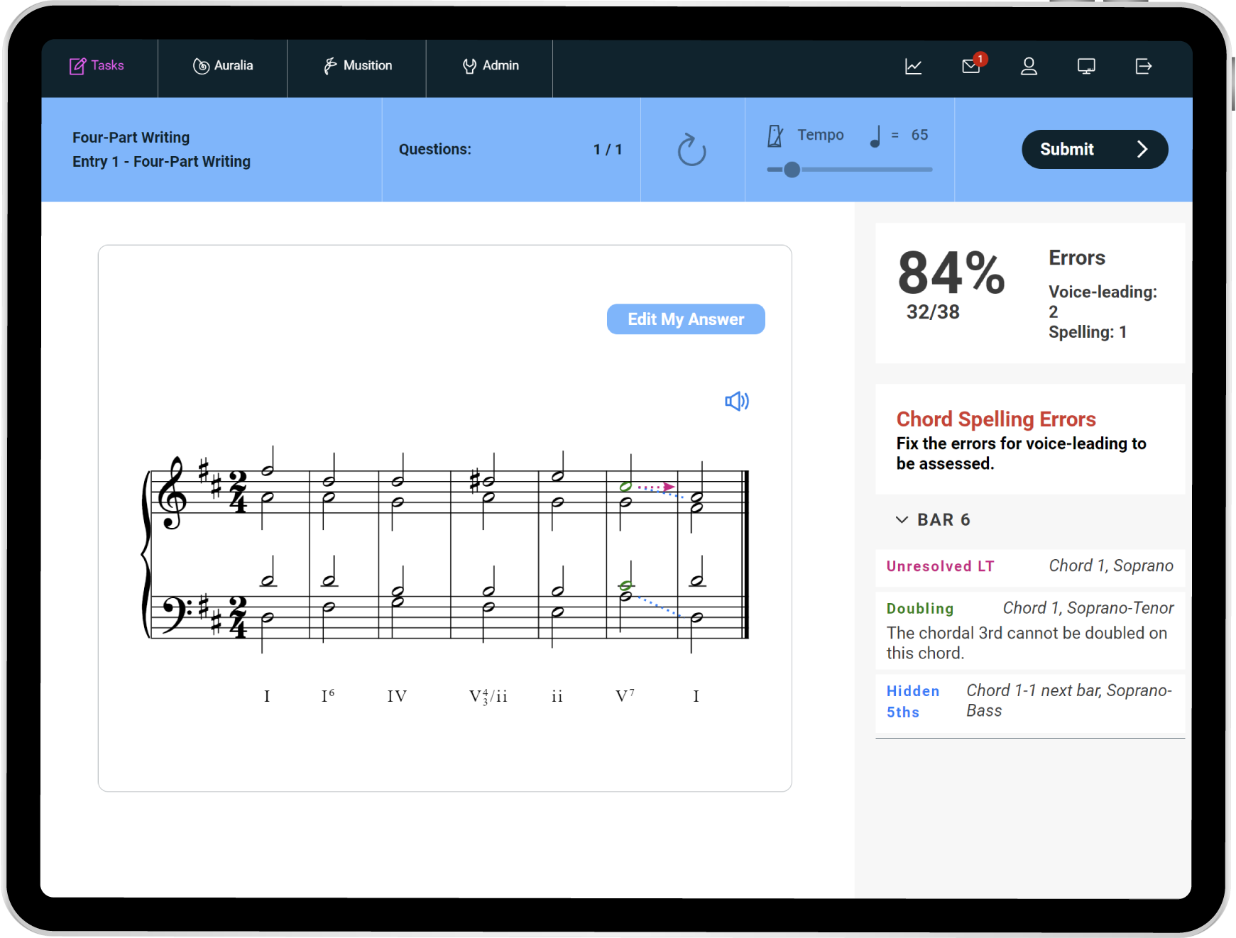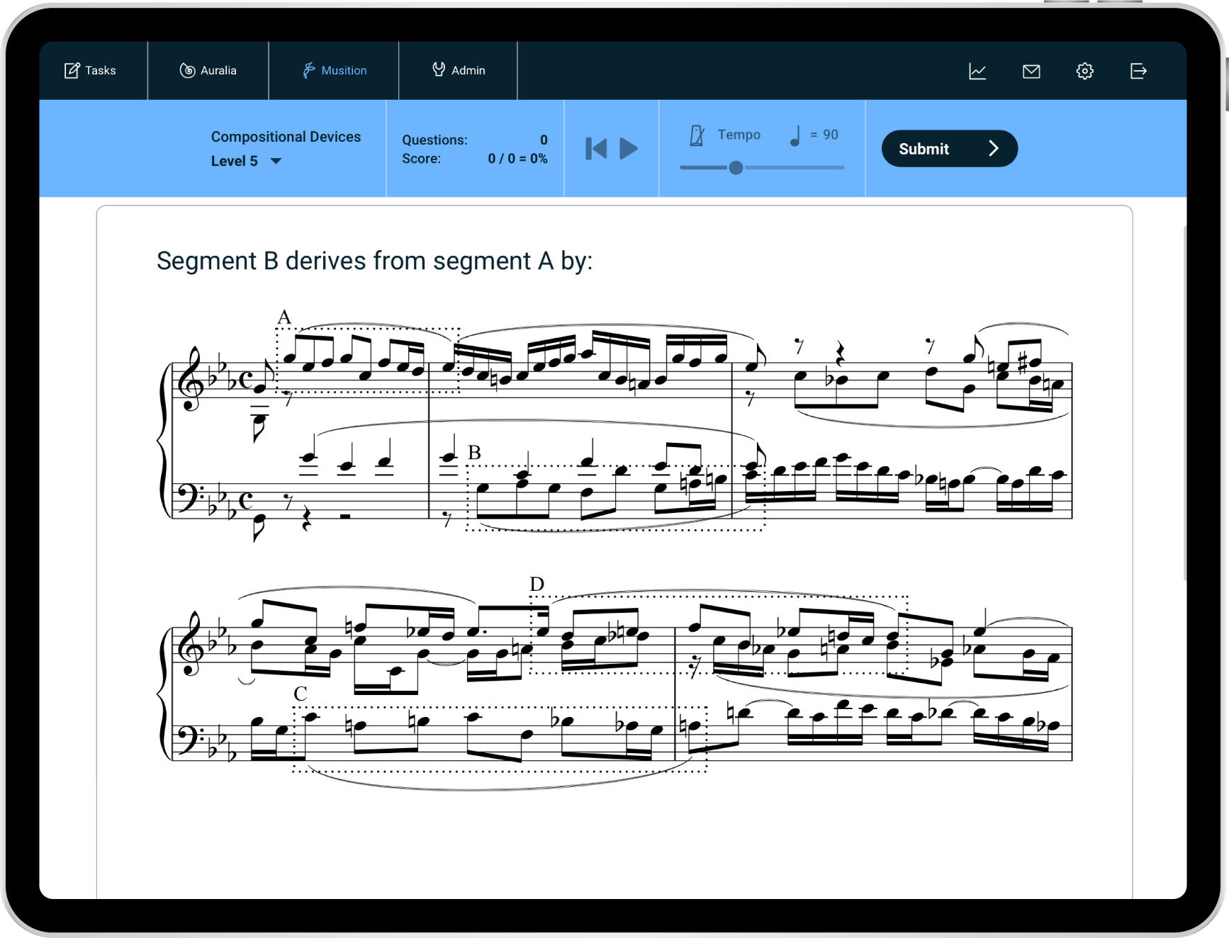 Musition includes practice syllabi and automatically assessed worksheets that align with Theory I-IV courses. From diatonic harmony to chromatic chords, and modulation, through to post tonal concepts, Musition supports your students over 4+ semesters.