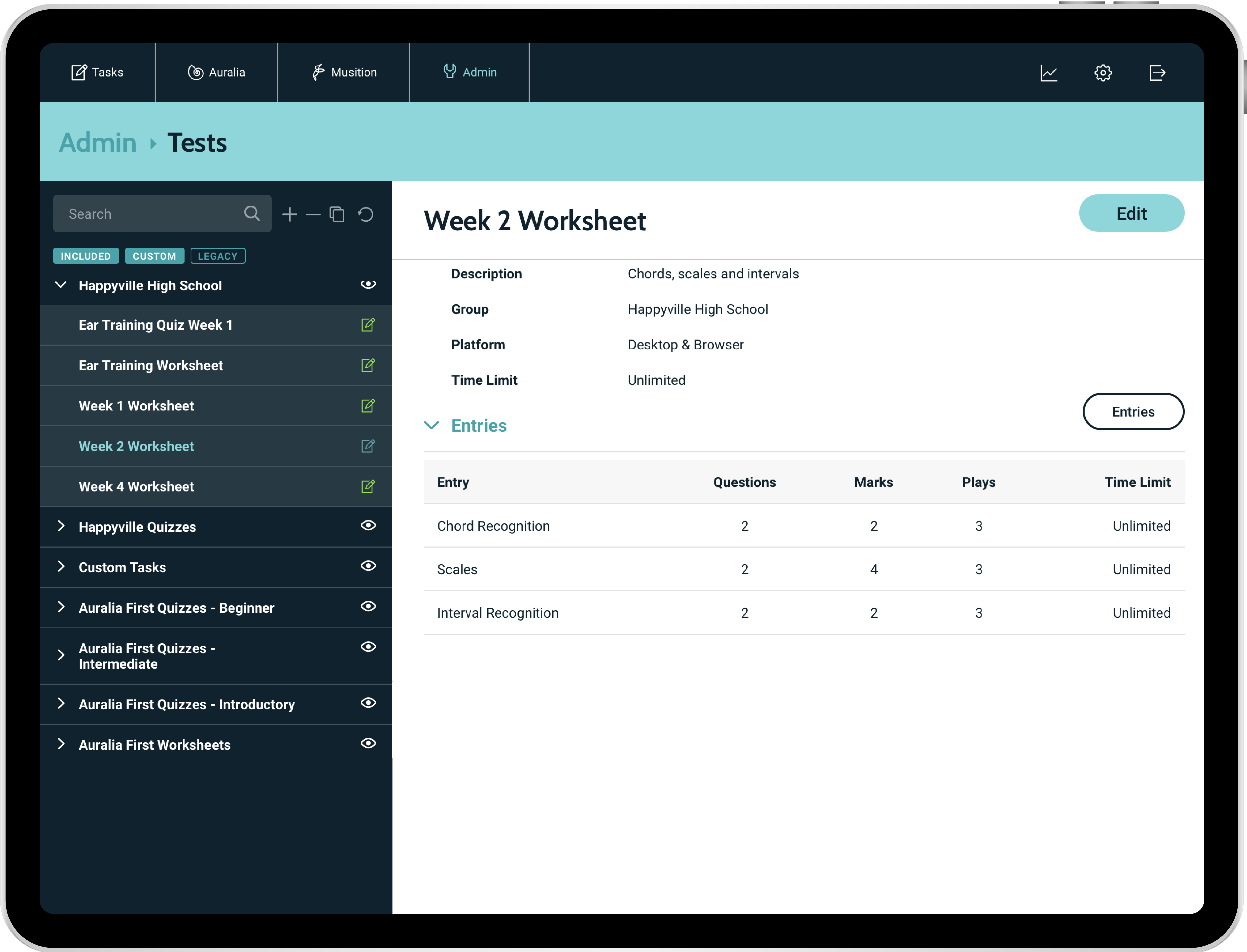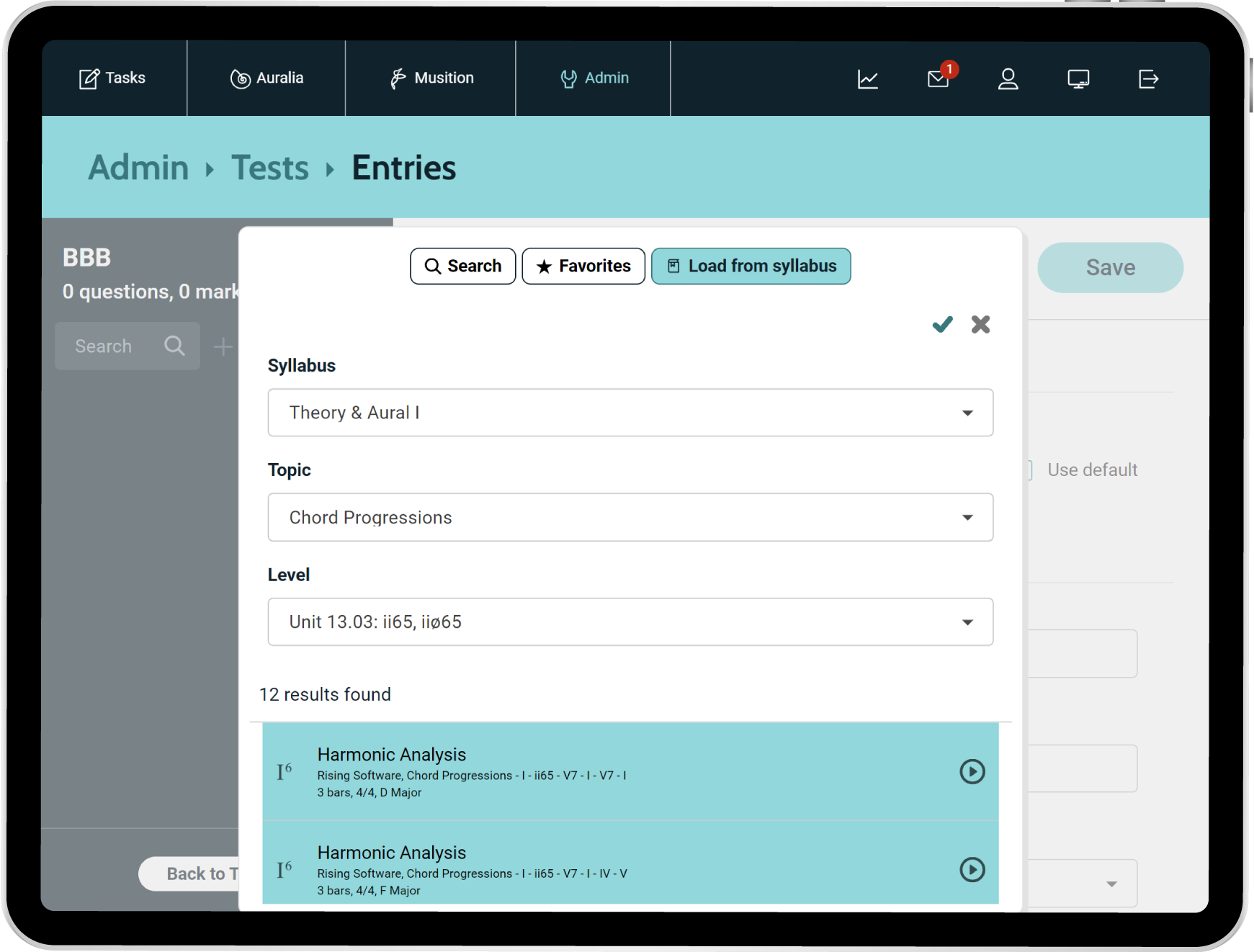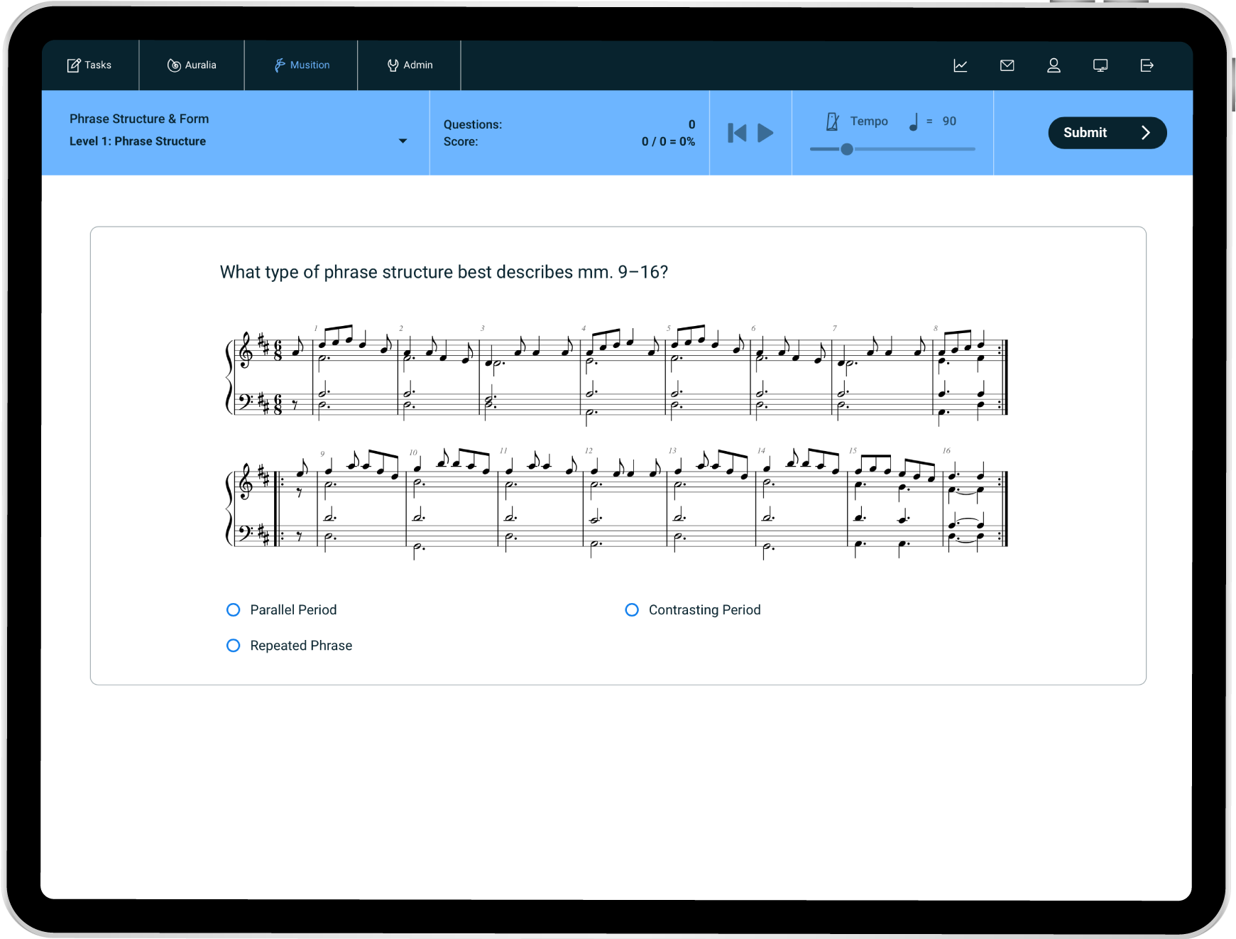 Customize the platform to suit your curriculum needs. Copy and edit the provided content or create your own questions and syllabi. Import audio, notation, images and YouTube links.