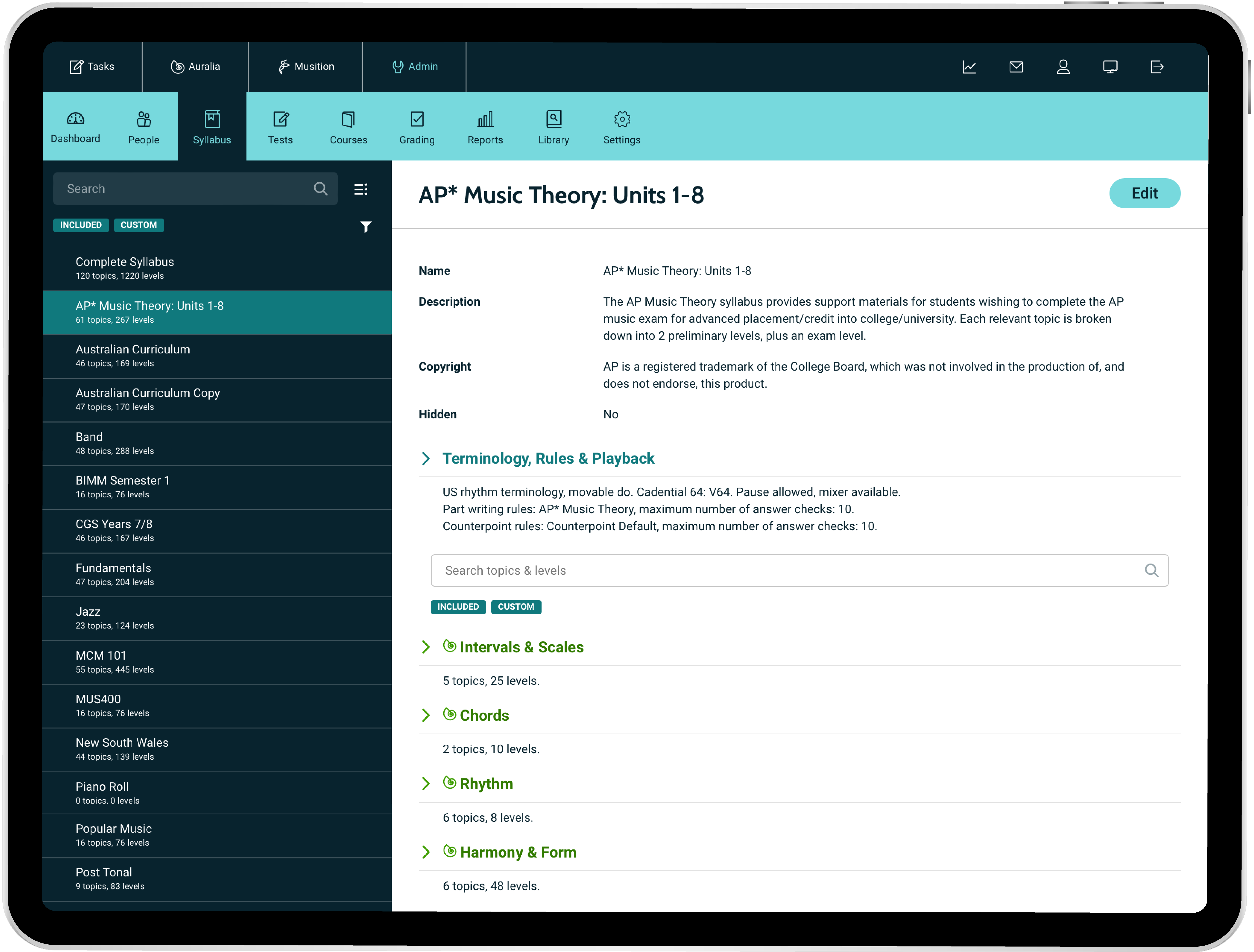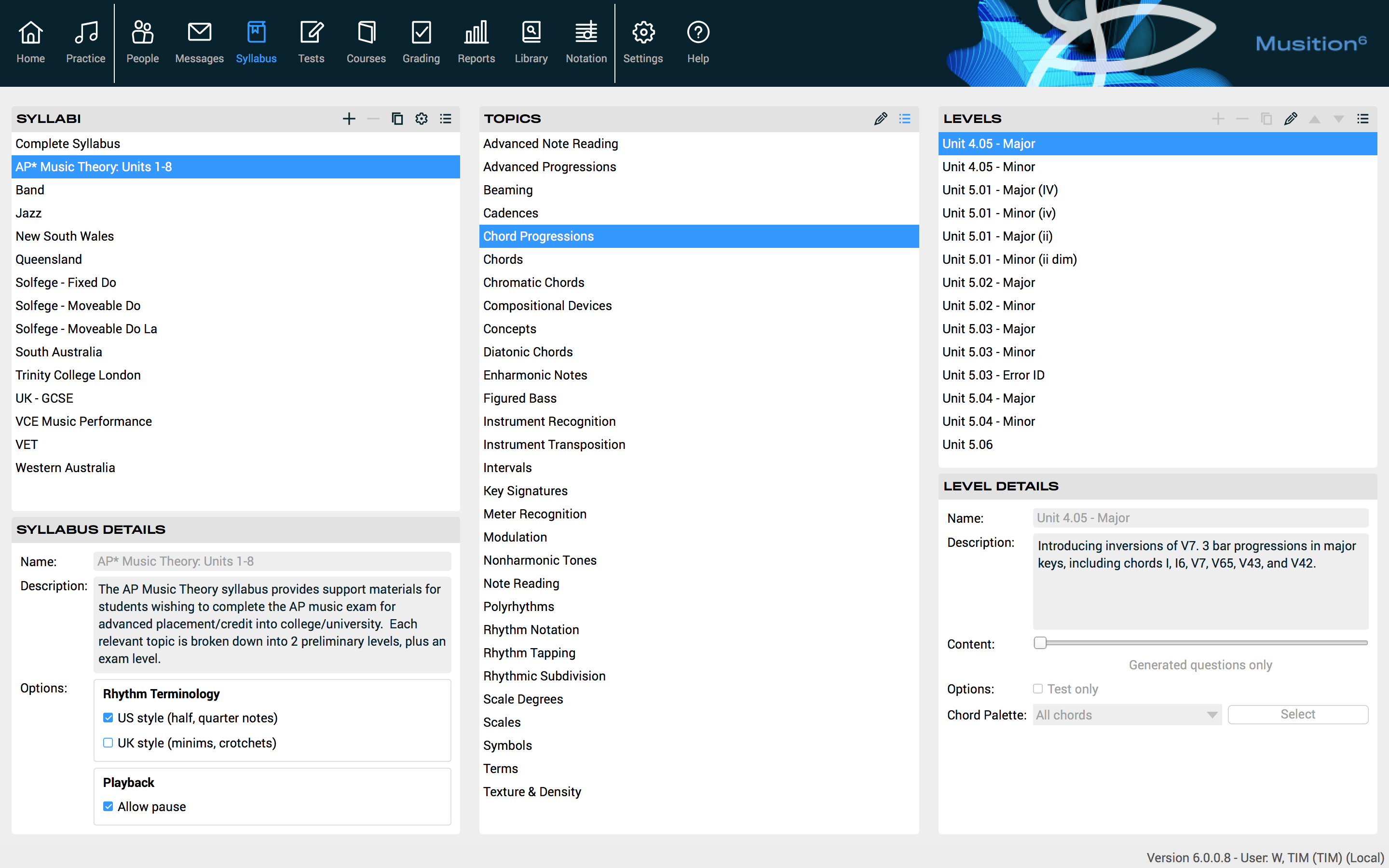 Musition has been specially designed to allow it to easily support multiple syllabuses, so that students can practise ear training topics that is absolutely relevant to the curriculum that they are using.