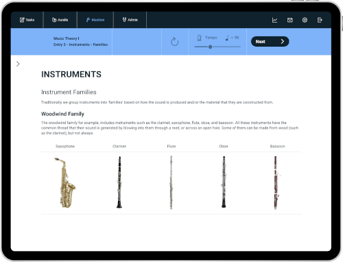 Each of the topics in Musition has an accompanying Lessons module, where you can learn about the concepts that you will be practising. Lessons contain text, audio recordings and notation and are an invaluable digital textbook both at home and in the classroom.