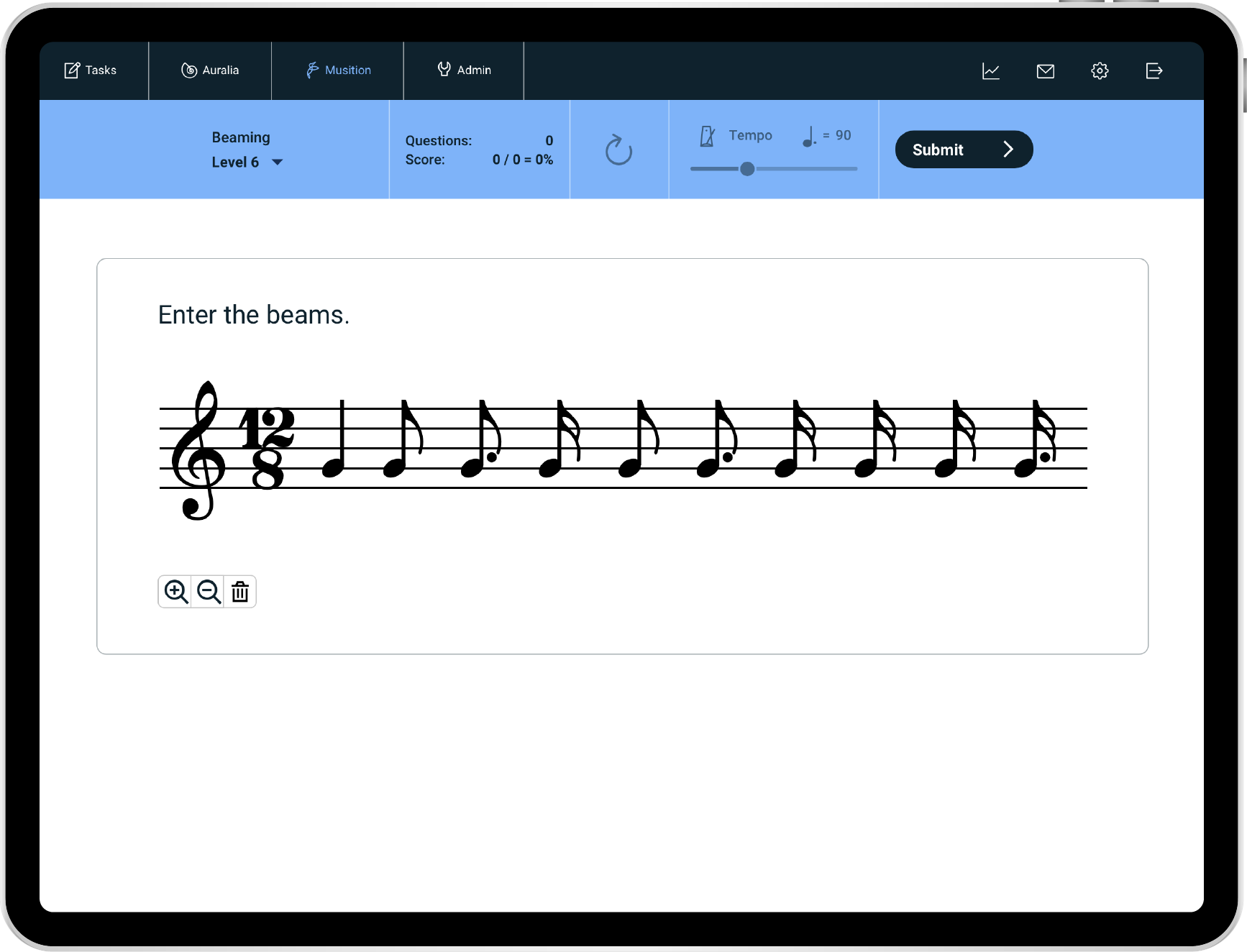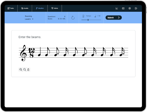 A rhythm without beams is shown on screen, and you are asked to enter the correct beams.