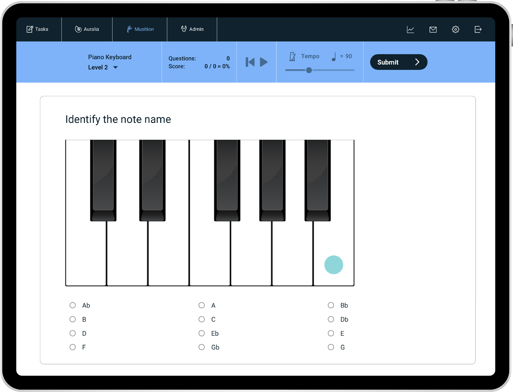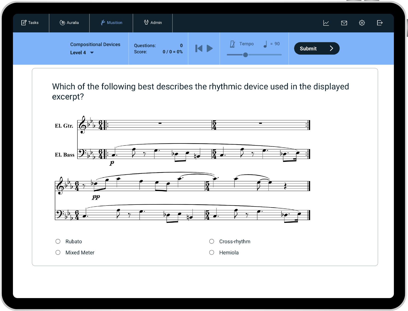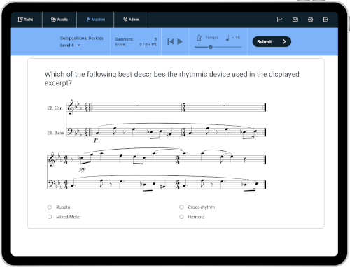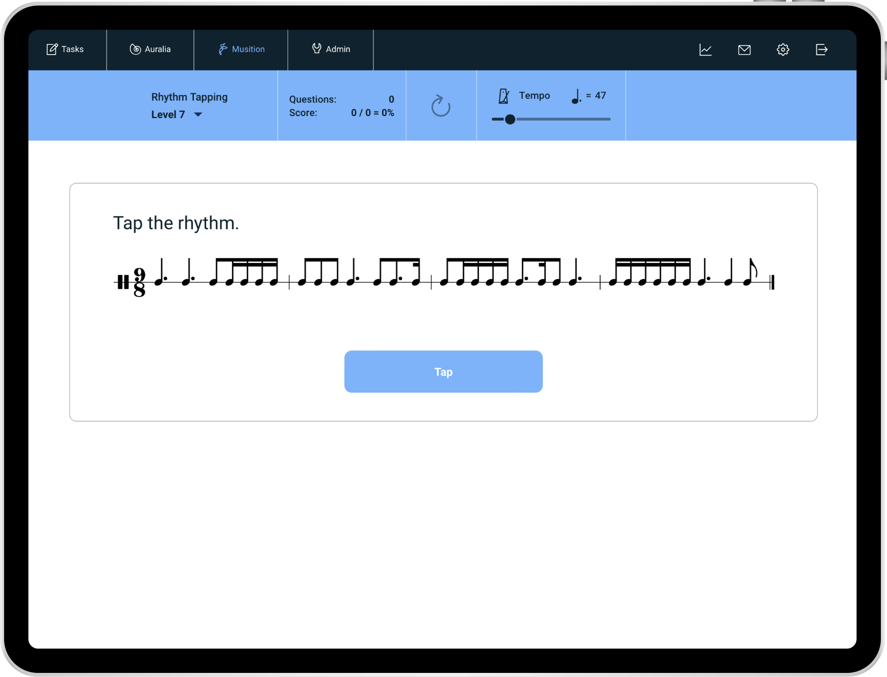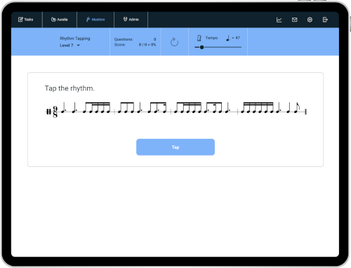 Tap back the rhythmic pattern shown on screen. You may also tap the rhythm in using an external MIDI device such as a keyboard or wind controller, if connected.
