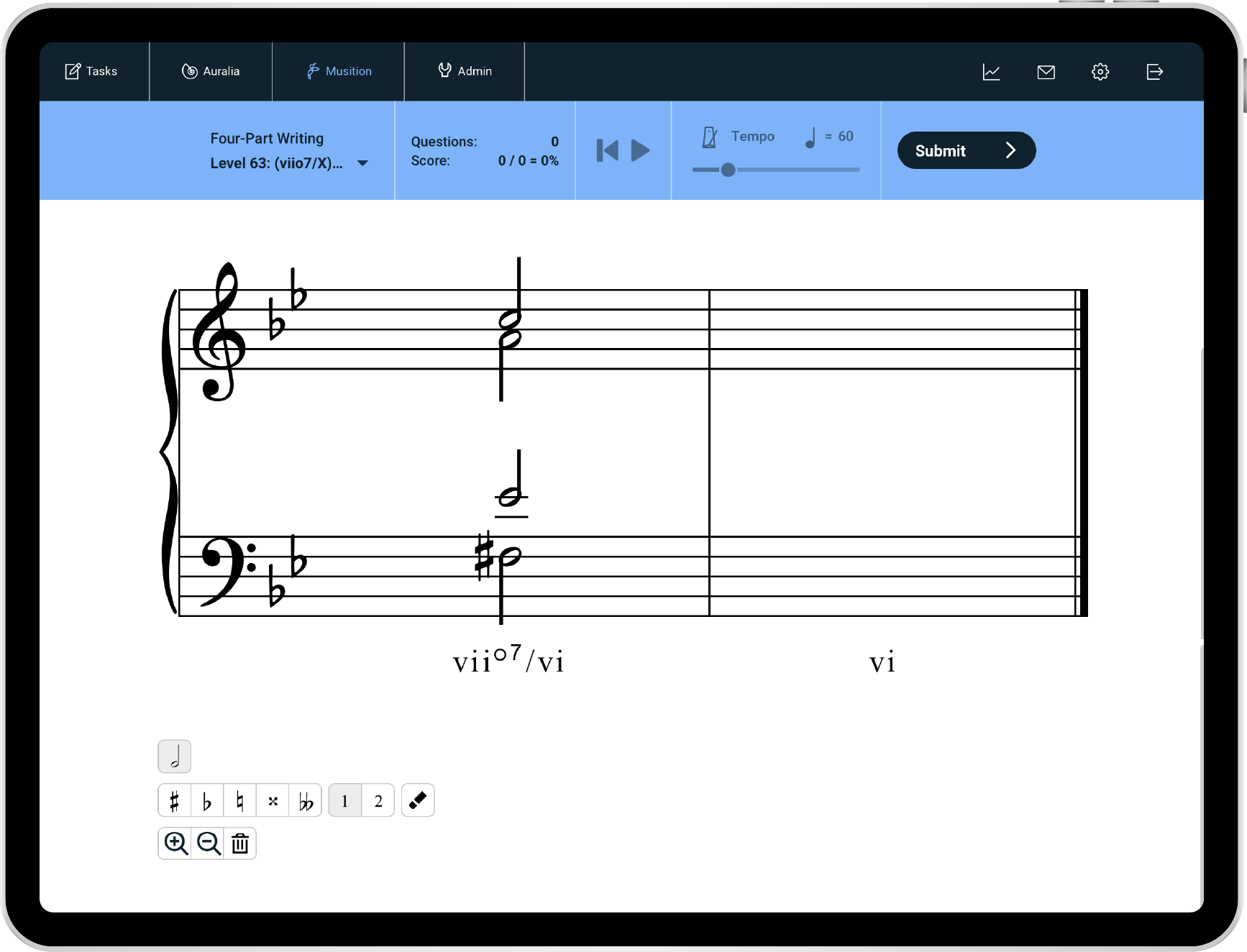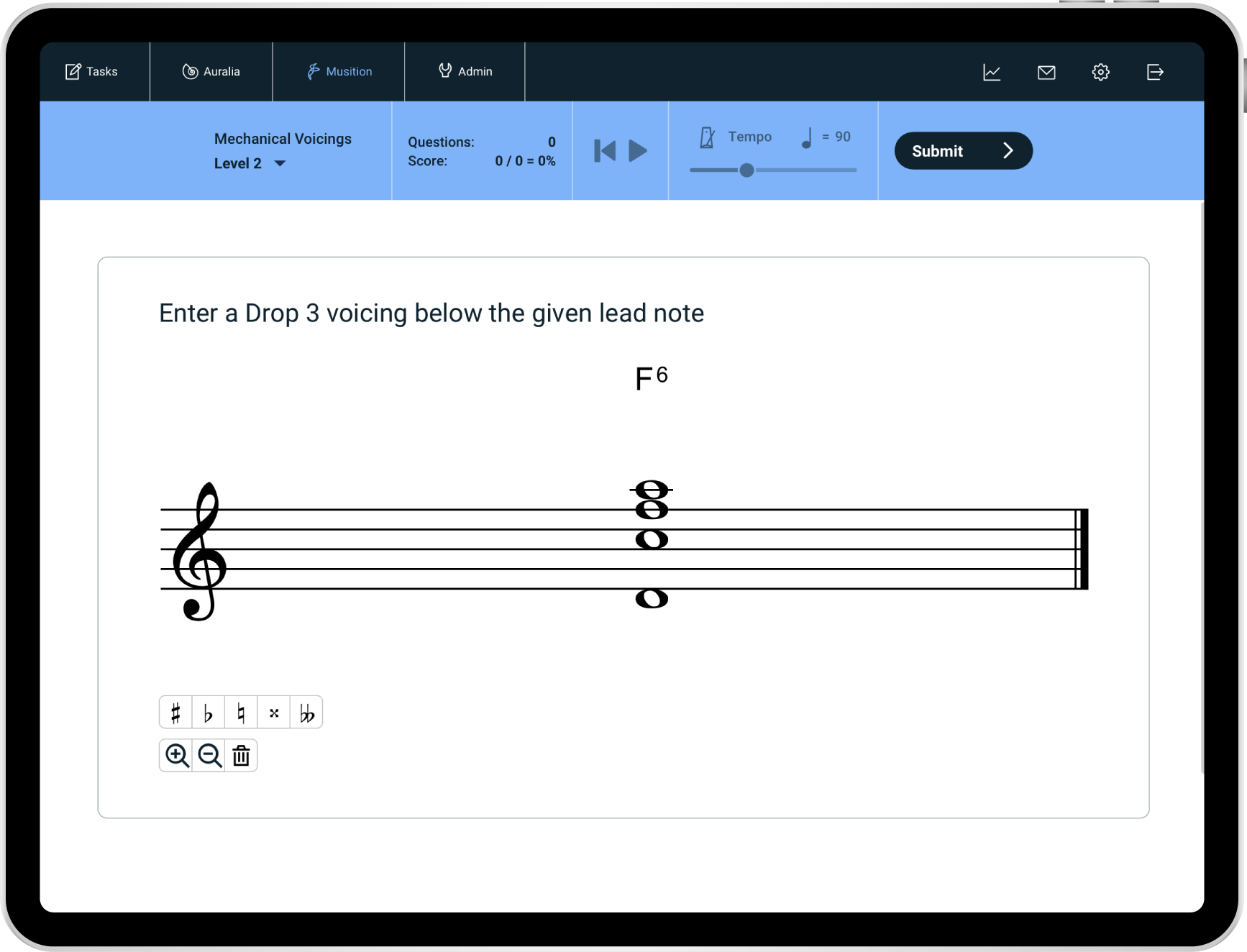 Realise given figured bass, enter chords notes on the staff. Includes all triads and sevenths, with inversions.