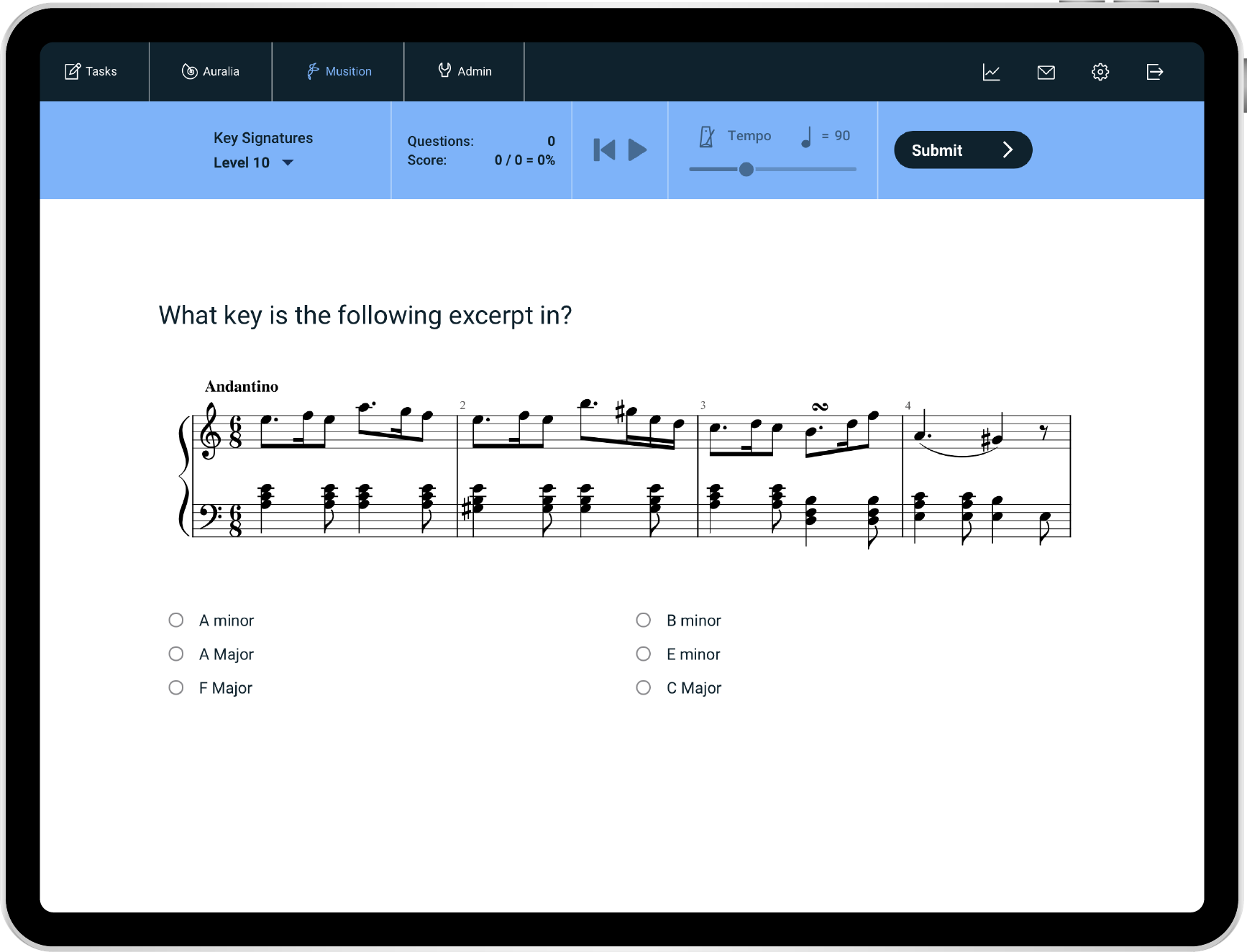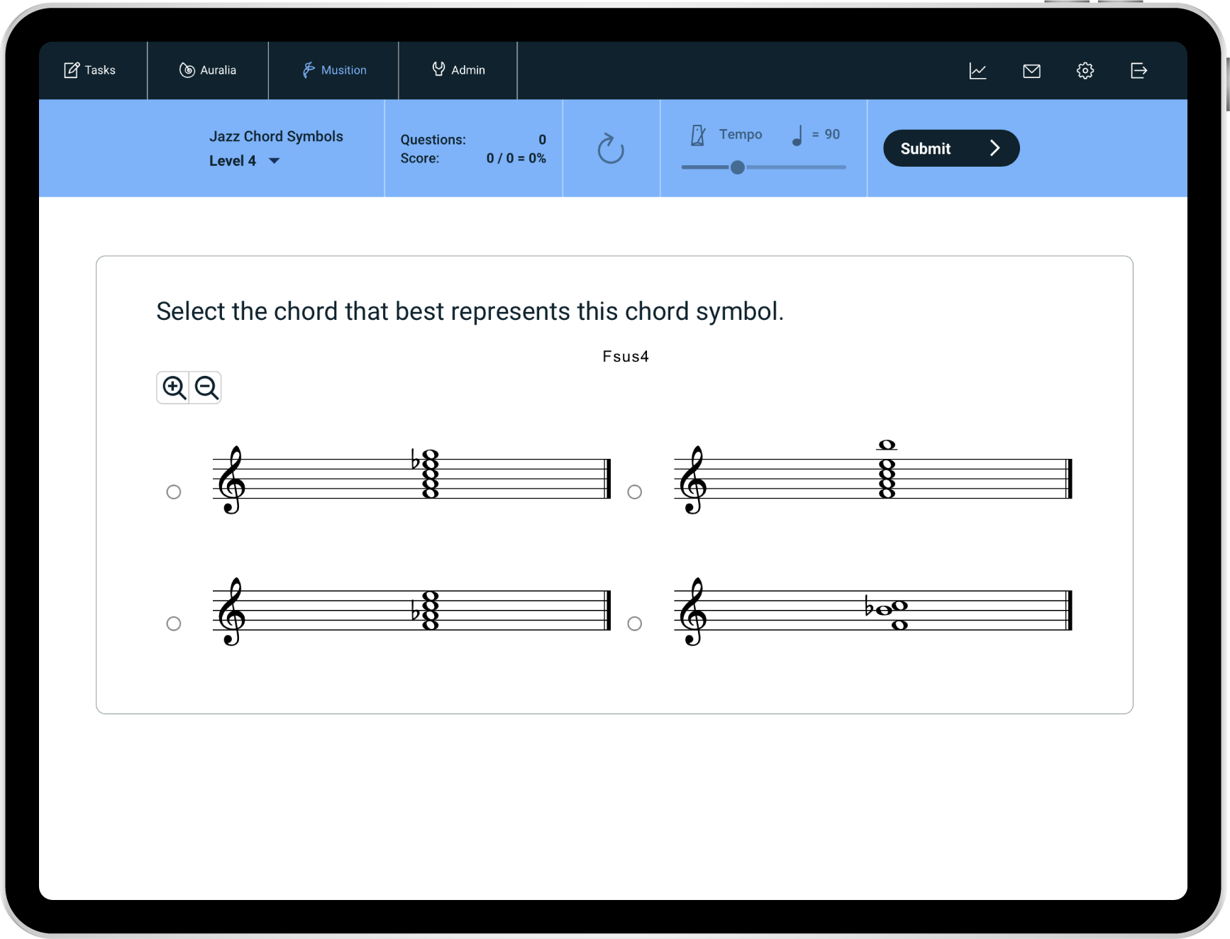 In Chord Progressions, 4 part harmonic progressions are shown, and you are asked to identify the chords. You will need to identify the chord quality, as well as the position.