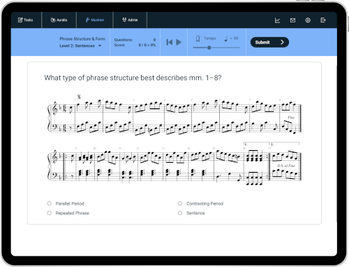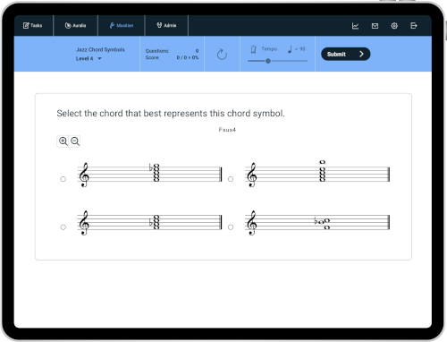 In Advanced Chord Progressions, 4 part harmonic progressions containing chromatic and mixture chords are shown, and you are asked to identify the chords. You will need to identify the chord quality, as well as the position.