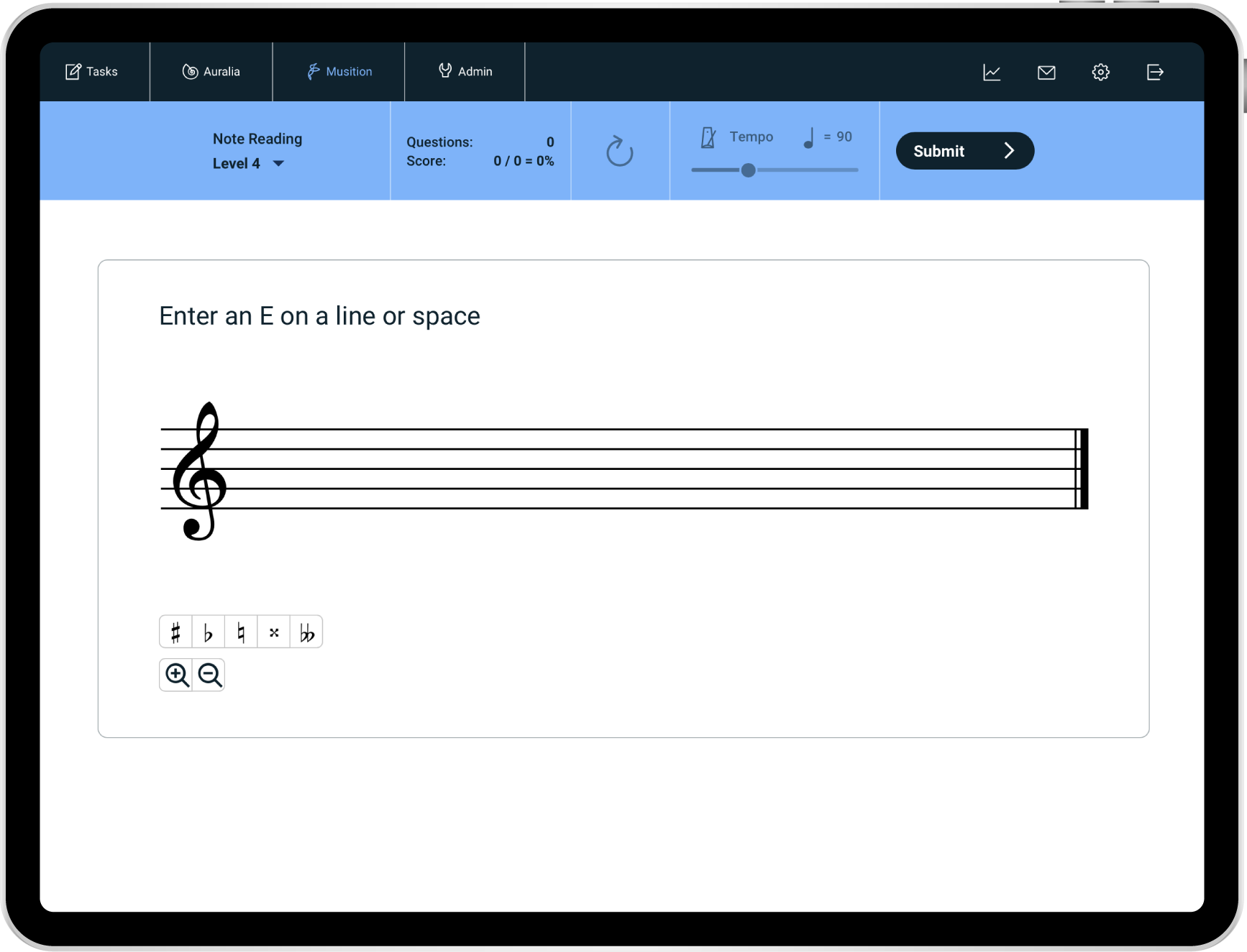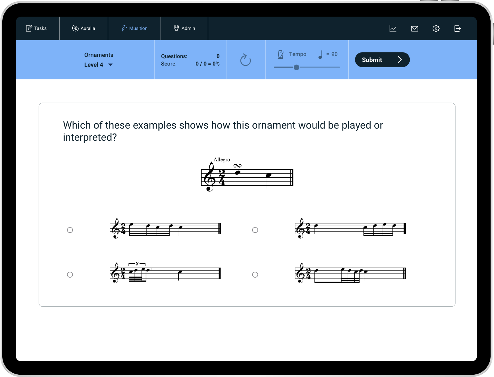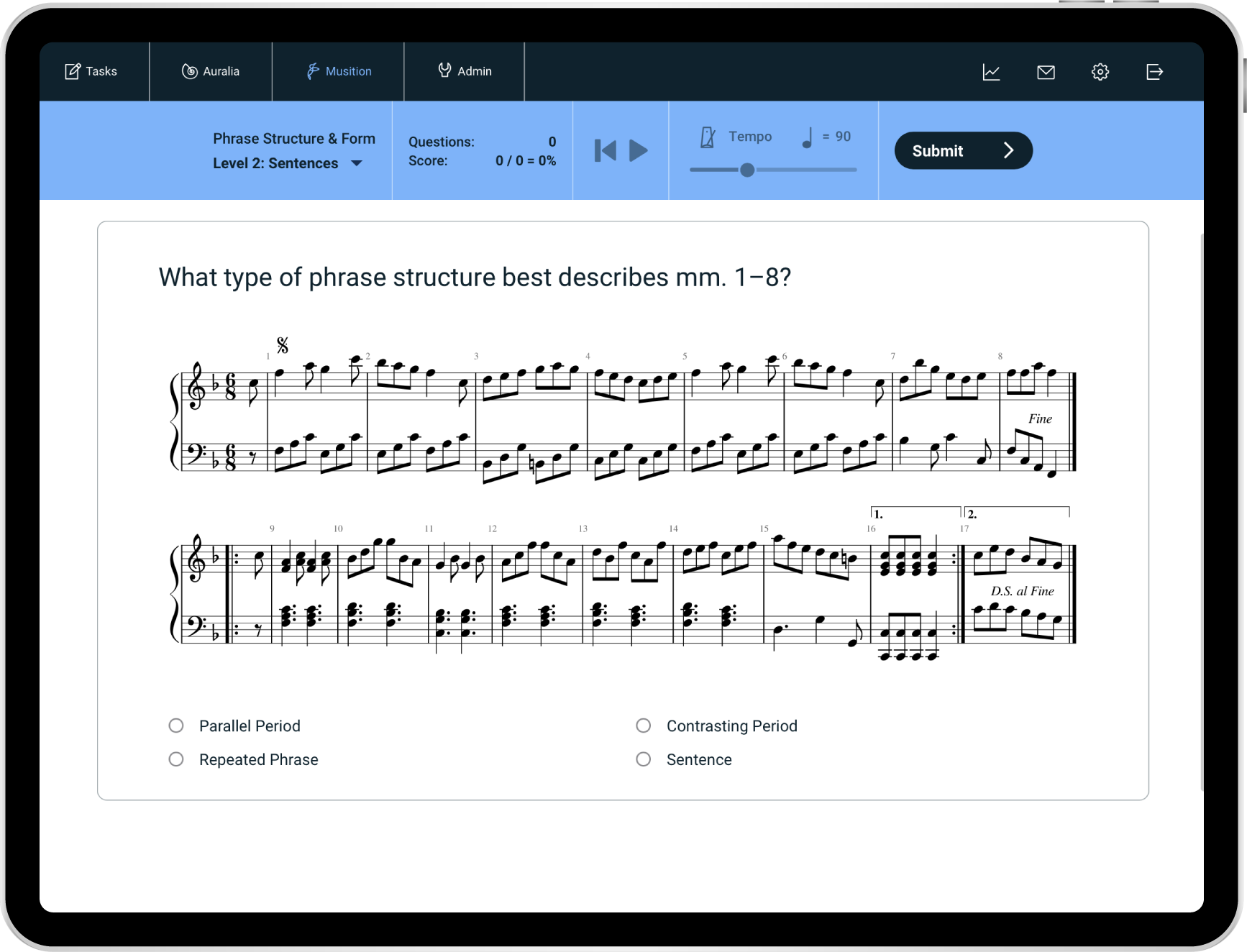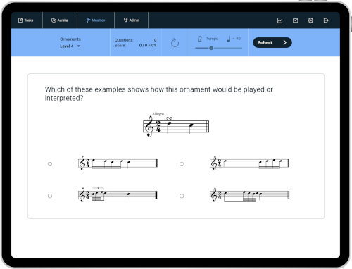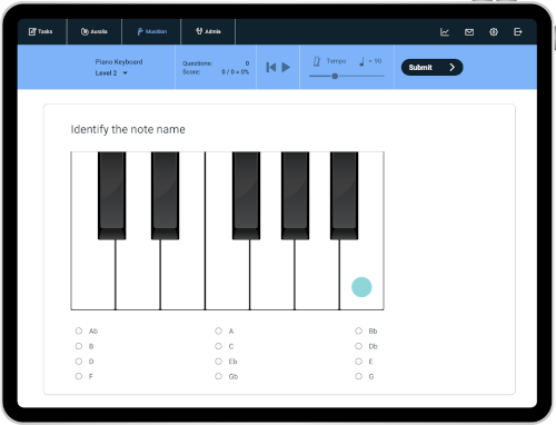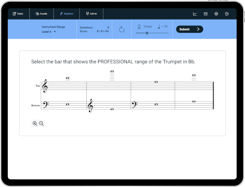 There are 61 topics in Musition®, divided into seven groups: Pitch, Rhythm, Terms & Symbols, Harmony & Instruments, General Knowledge and Composition.