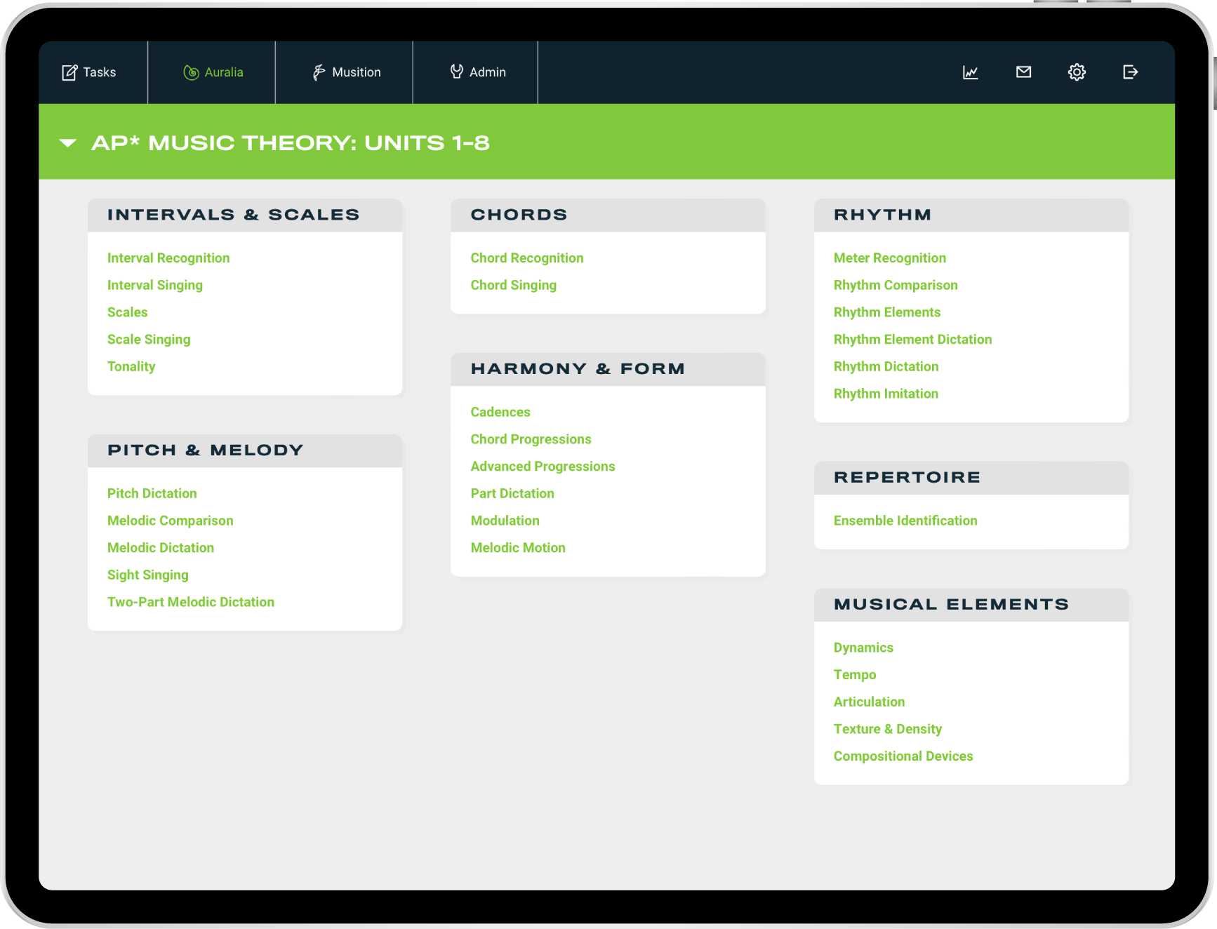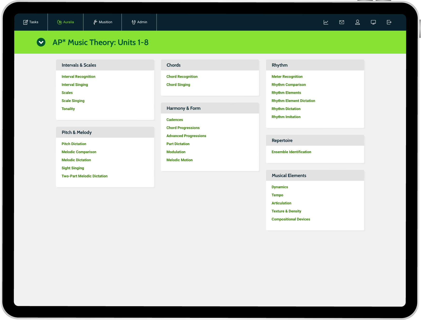 The revised AP* Music Theory syllabus now includes four-part writing and sight singing drills. Levels and worksheets are mapped directly to the CED, providing clear learning pathways, with hundreds of exam specific questions.