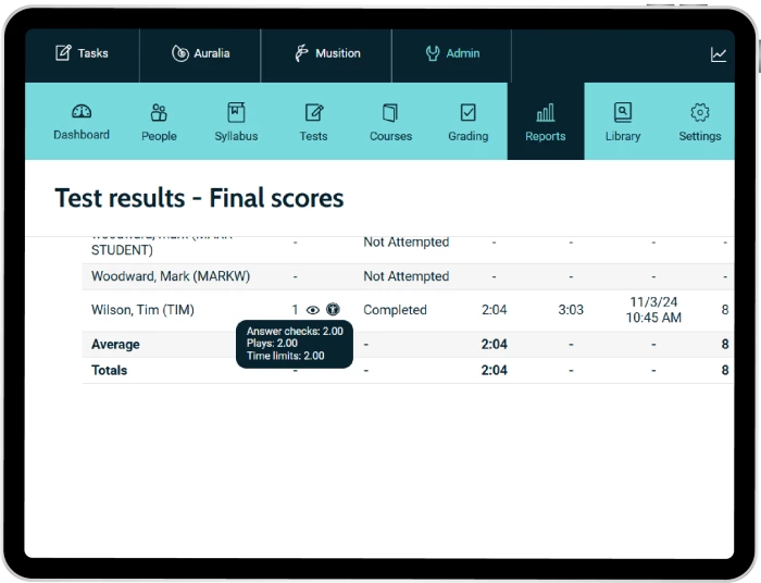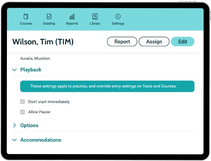The new accommodations feature makes Auralia & Musition more accessible than ever. Instructors can easily assign extra time, replays or answer checks (four-part writing and counterpoint) on any task without having to create duplicate assignments. This is a huge timesaver! Also, 'immediate playback' can be disabled on a per student basis. So, if required, a student can now work through the question text with a screen reader before playback for the question begins.