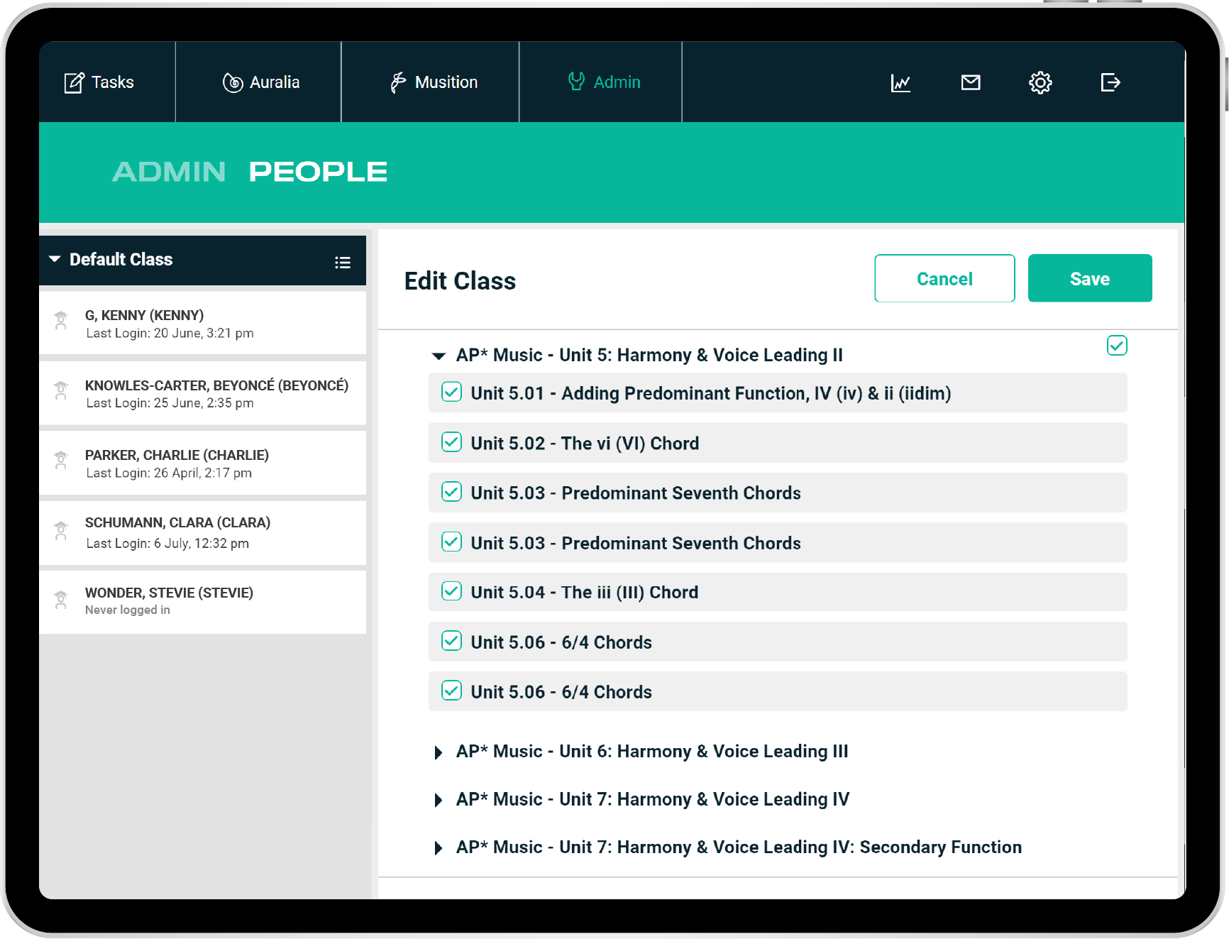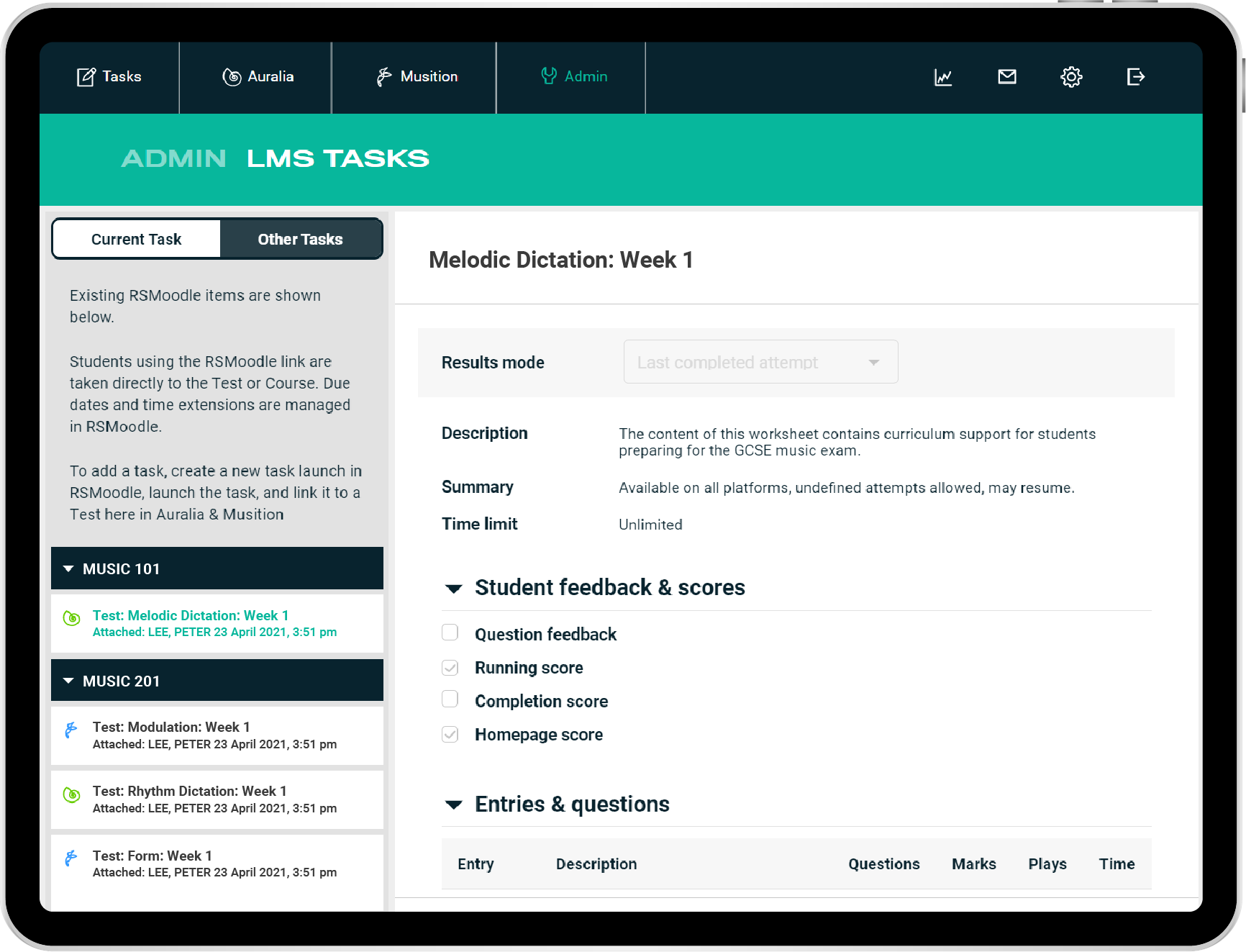 There is a dedicated ‘Tasks’ area where all your linked tasks are shown. These list the task name from your LMS, the task name from Auralia® / Musition®, when it was linked, and which instructor linked the task.