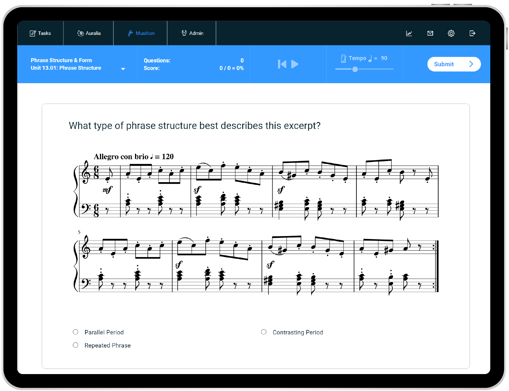 These questions have been integrated into our college fundamentals and Theory & Aural I - IV sequences, including practice syllabi, and 100+ worksheets. The aligned theory and aural content provides 15 week learning pathways for your students. You can easily assign these materials to your classes, or modify them to suit your curriculum.