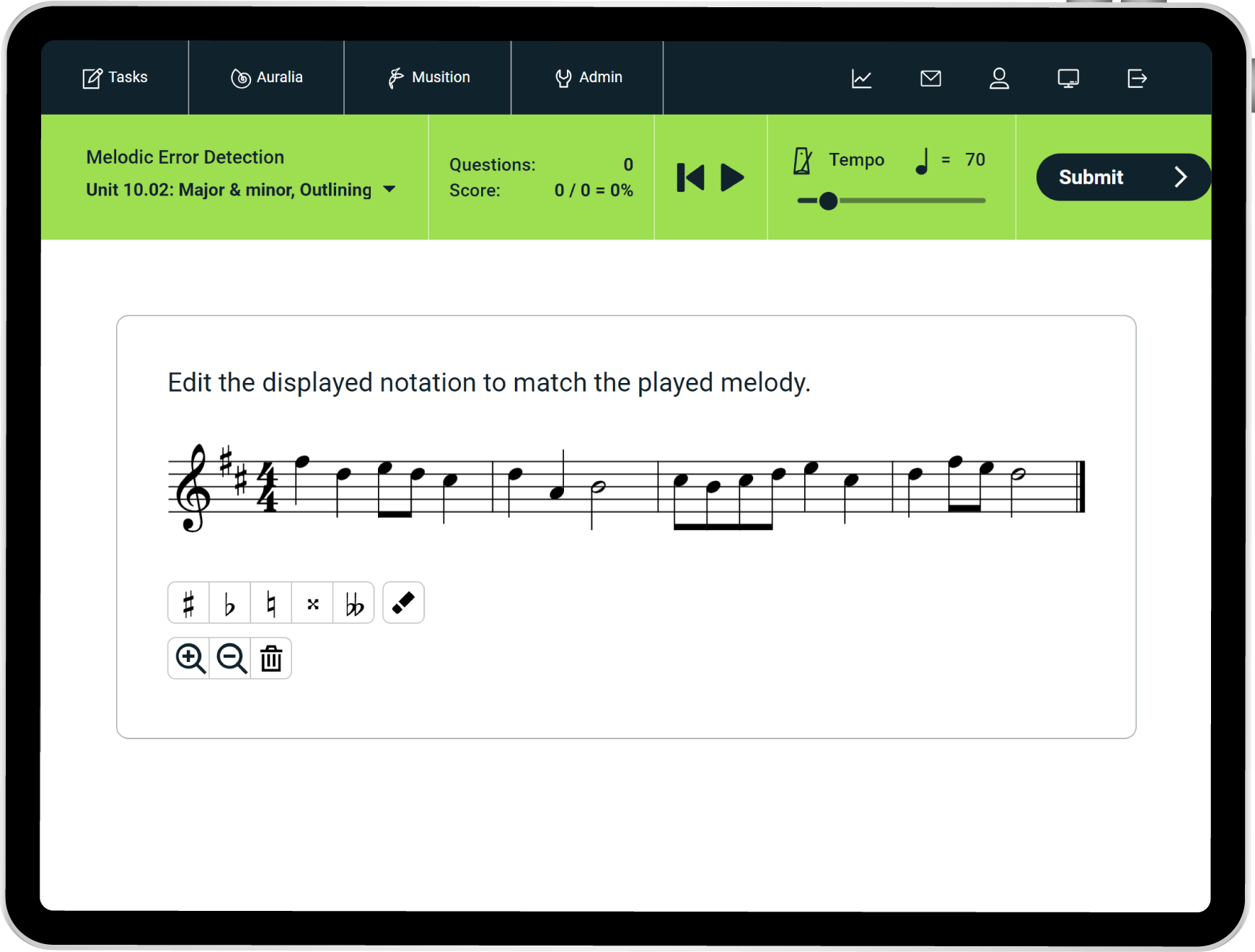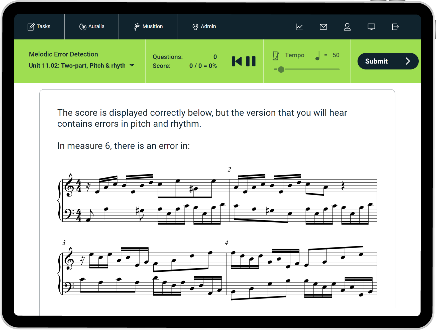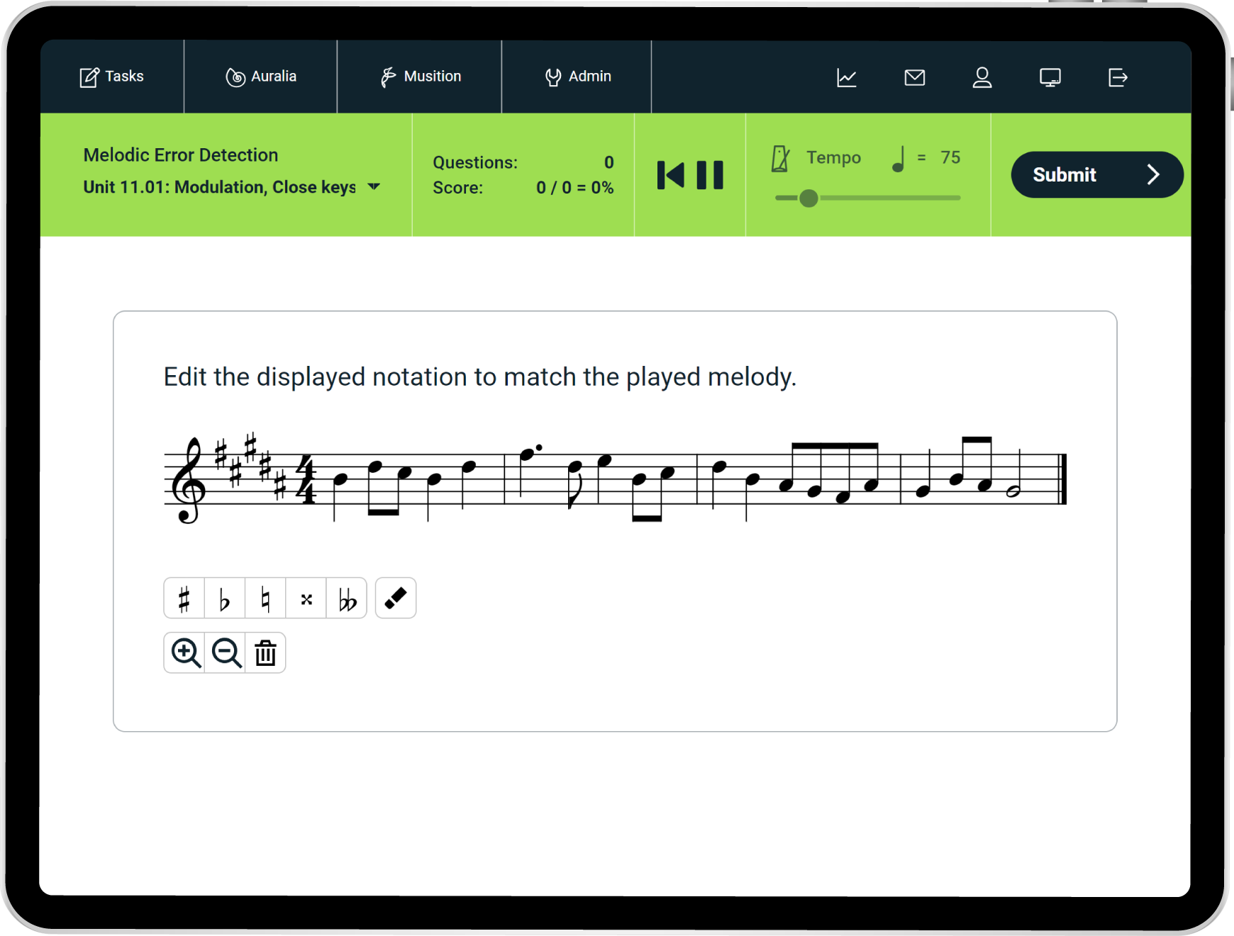 Auralia now includes 500+ melodic error detection questions where students have to identify performance errors in a played excerpt and edit the displayed notation to match what was performed. These exercises are fantastic for preparing students for real-world situations where they may need to identify and correct mistakes in rehearsals or performances.