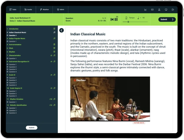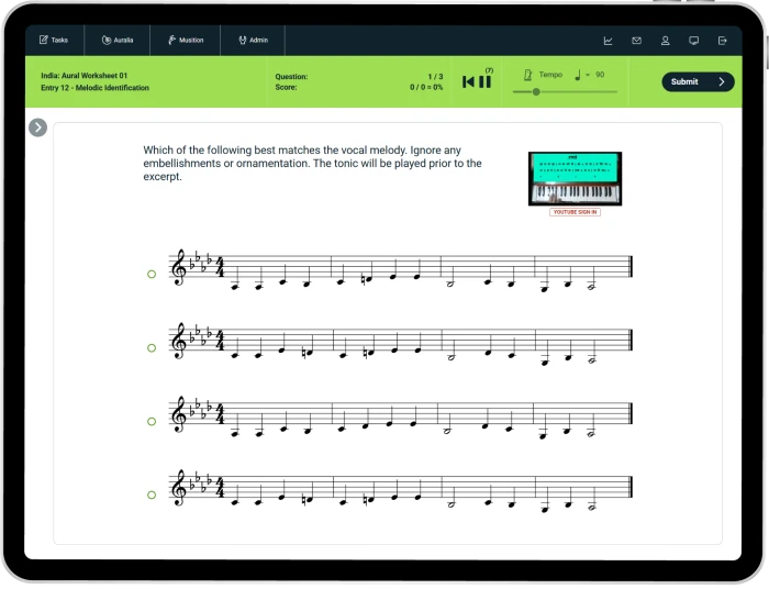 You will find questions on meter, texture, scales & modes, scale degree ID, melodic ID and dictation, plus clave patterns, African bell patterns, Indian thaat, drone improvisations and lots more.