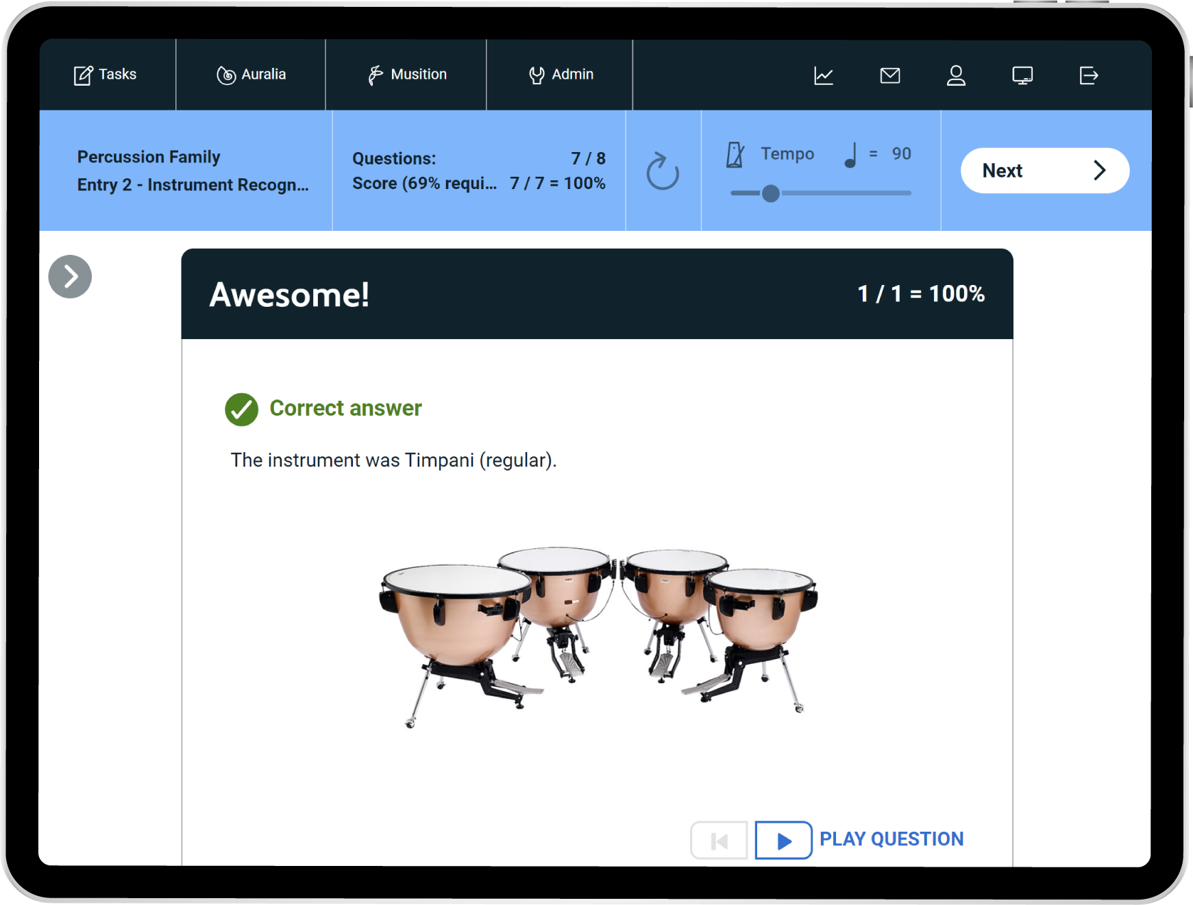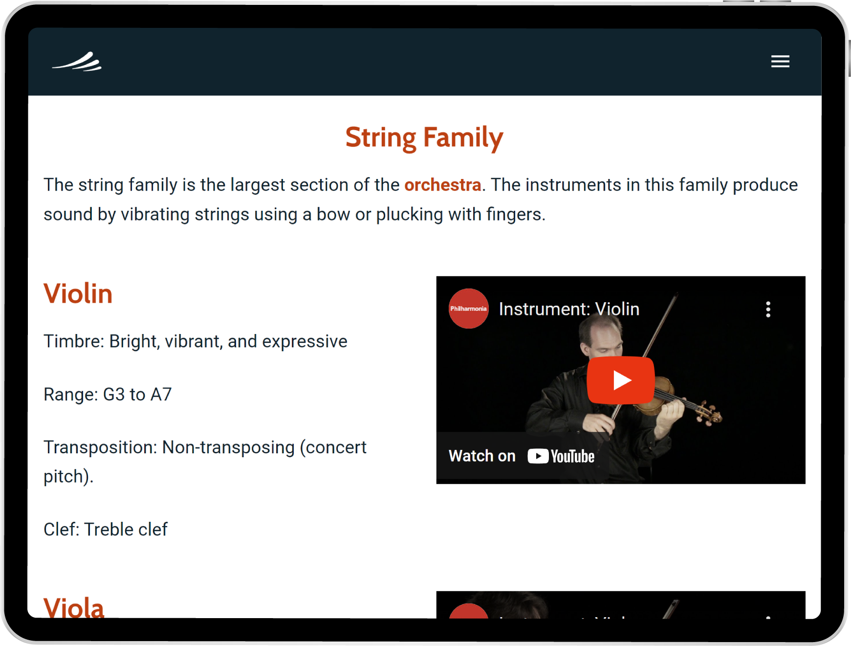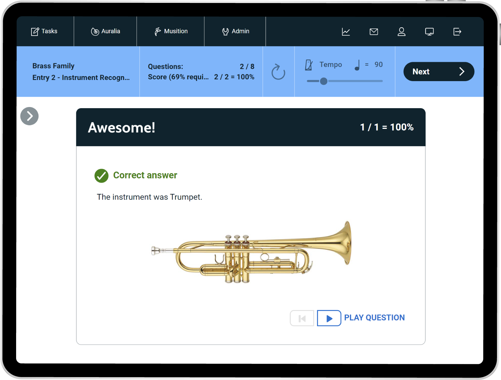 Musition now features five new courses based around the instruments of the orchestra. Each course focuses on a particular instrument family and includes questions on instrument recognition, sound production, clefs, pitch, techniques, terms and symbols. Students can also engage with the instruments of the orchestra lessons featuring video demonstrations and explanations of each instrument.