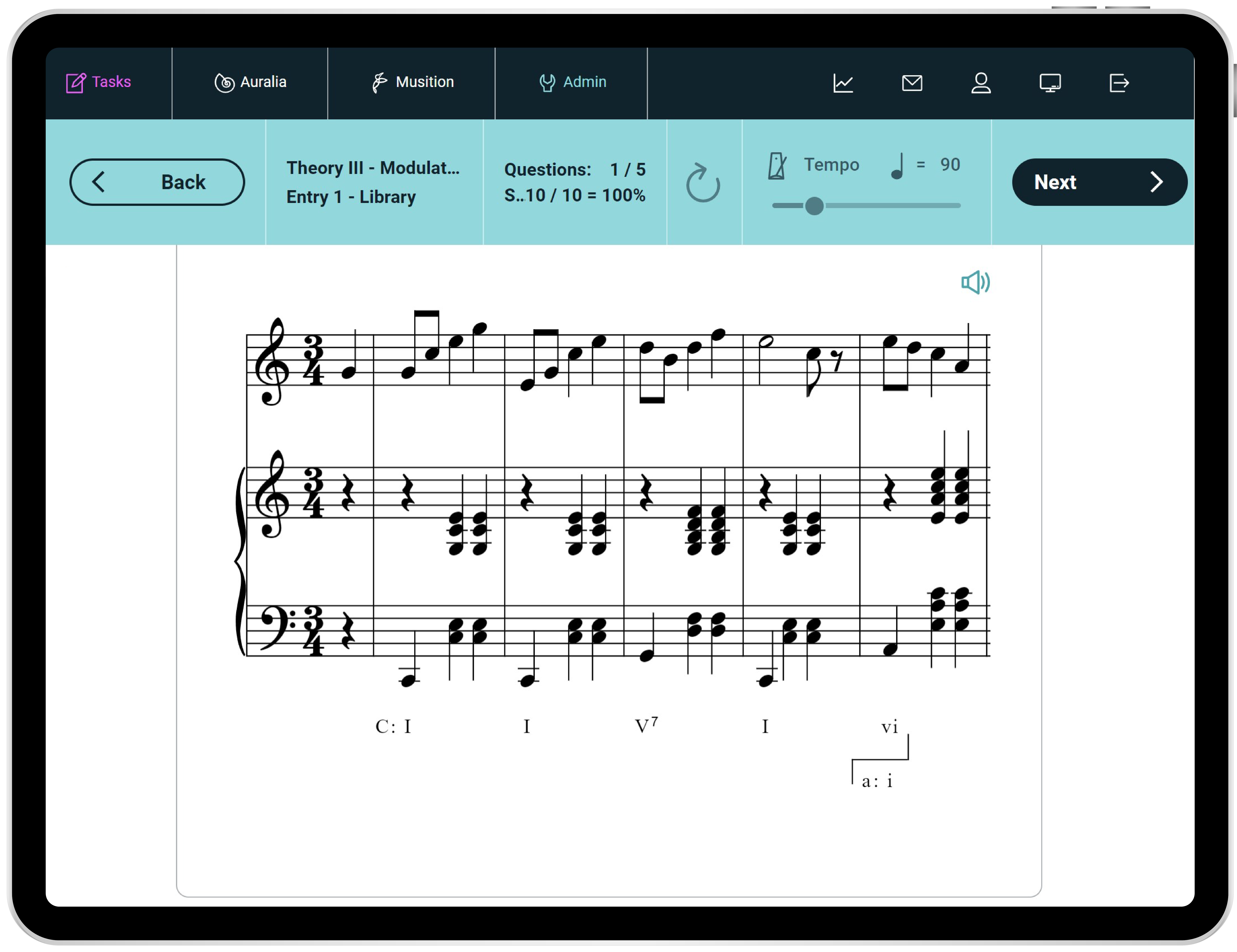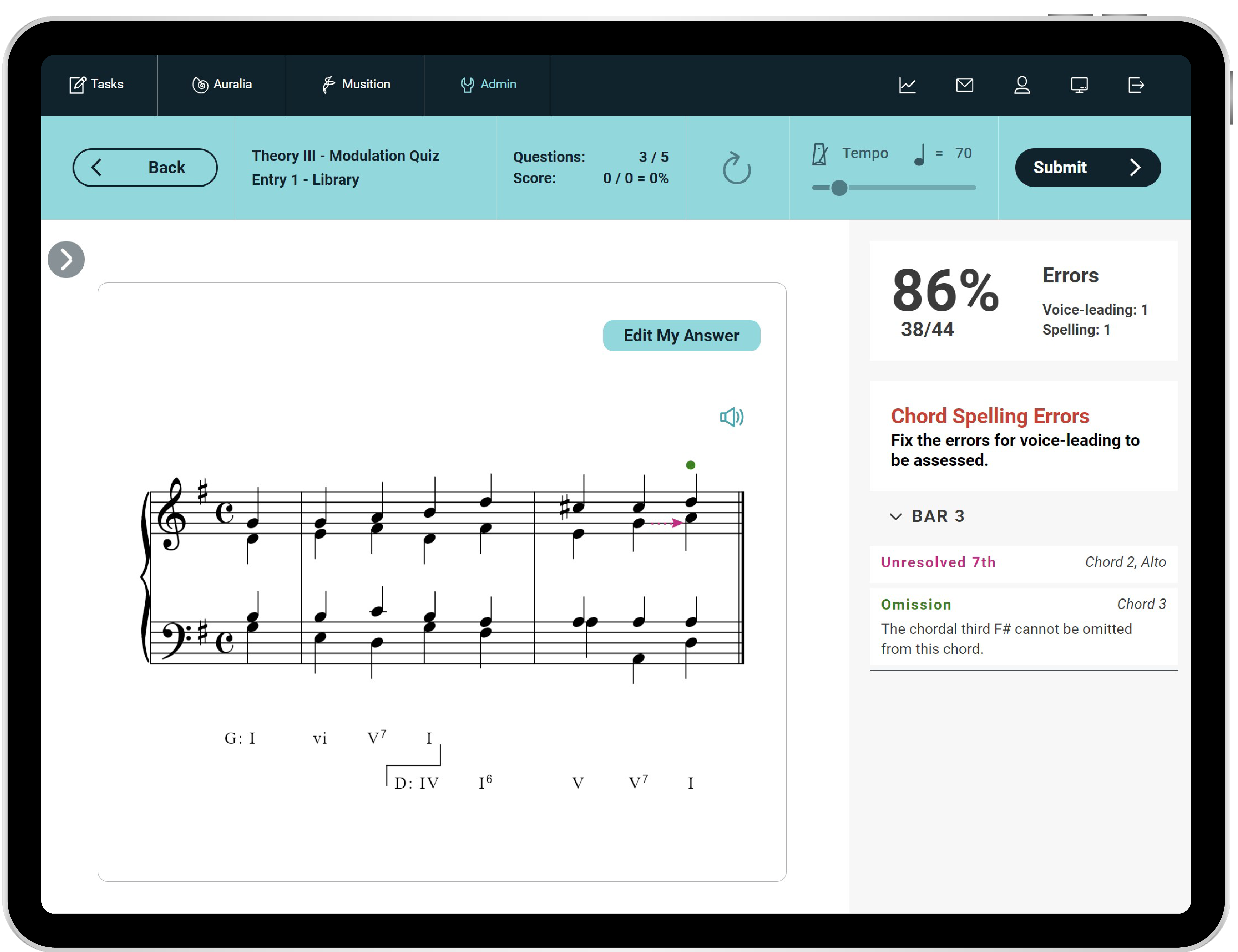 Auralia & Musition now support modulation! This includes display and entry of the starting key, plus pivot and direct modulations; perfect for harmonic analysis, four-part writing, harmonic dictation and creative question types.
