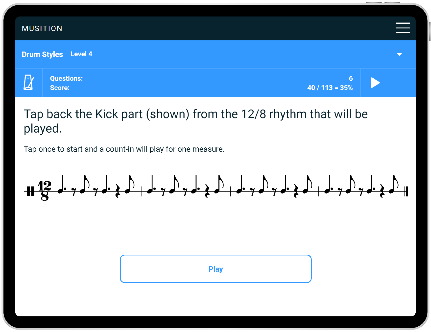 Drum Styles asks the student to tap a single part from a drum groove and then assesses their rhythmic accuracy. This is a fantastic topic for teaching rhythm reading within a musical context.