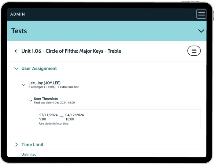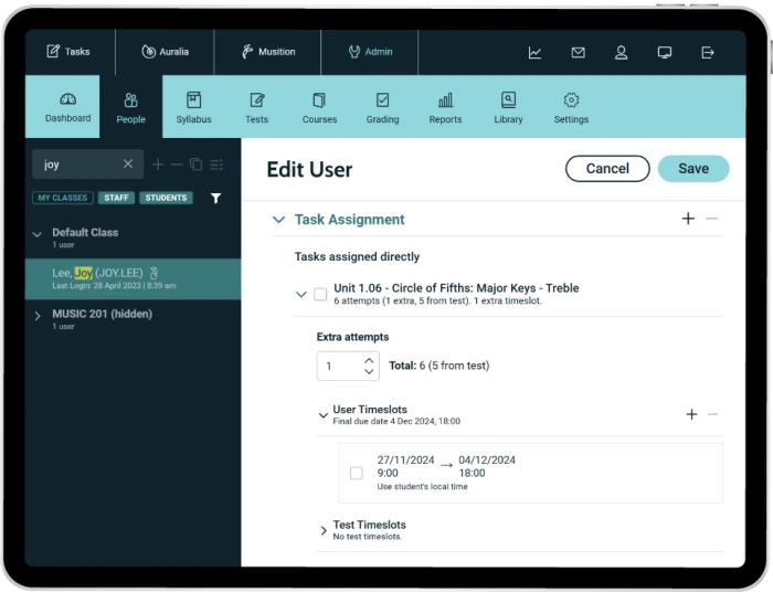 Worksheets and assessments can now be assigned on a per student basis with independent timeslots and extra attempts. This is particularly awesome for cases where a student misses a worksheet or assessment deadline (set as a timeslot in Auralia or Musition), or perhaps deserves an extra attempt at completing a task.