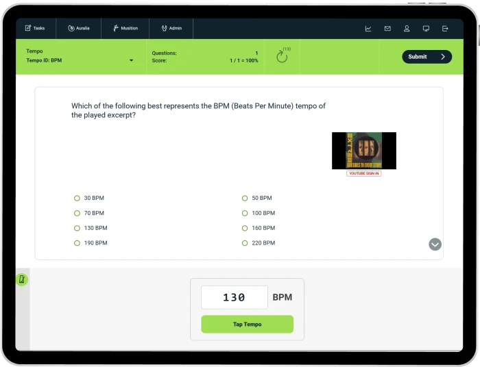 Auralia now includes an integrated tempo tapper for tempo identification questions. Students can tap along to YouTube videos and audio recordings, reinforce their concept of pulse, and then select the matching BPM.