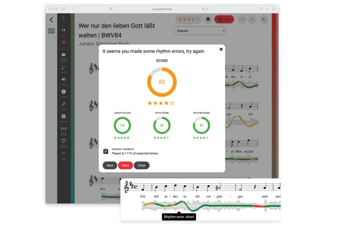 With PracticeFirst, you can get an in-depth look at your students' practice. Overall scores are given and broken down into three individual scores for length, pitch, and rhythm. Students can see detailed annotations by hovering over the feedback line. The assessment rigor is adjustable from "easy" to "hard," or "simplified" or "full" feedback to accommodate all levels. PracticeFirst provides feedback on rhythm, pitch, intonation, and duration.