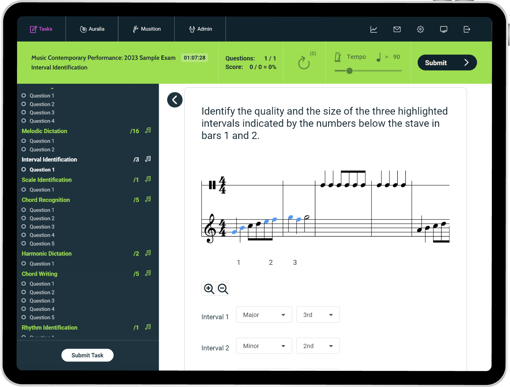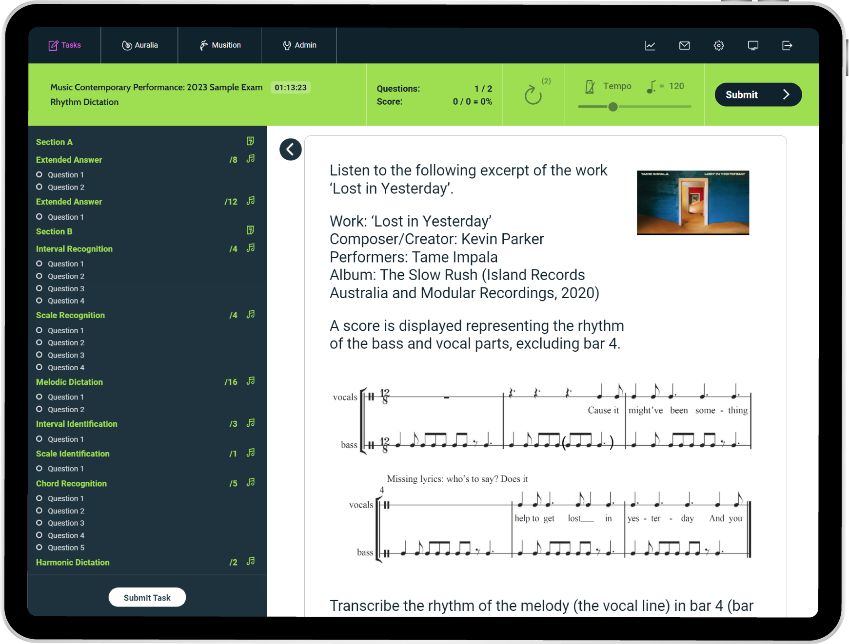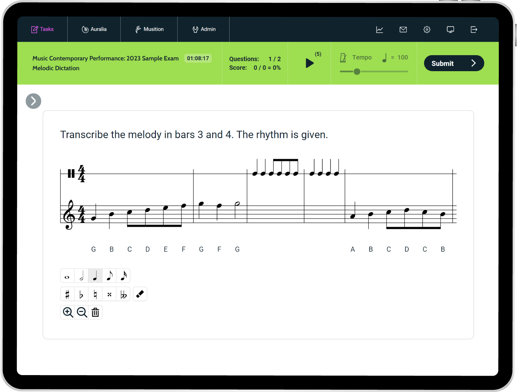 Auralia includes the 2023 and 2024 repertoire and contemporary exams using the examples, audio files and notation as provided by the VCAA. The exams are automatically assessed (excluding the Section A extended answer questions), saving teachers grading time and giving students instant feedback. Additionally, you can import your own materials, create custom questions and share them with the Auralia & Musition community.
