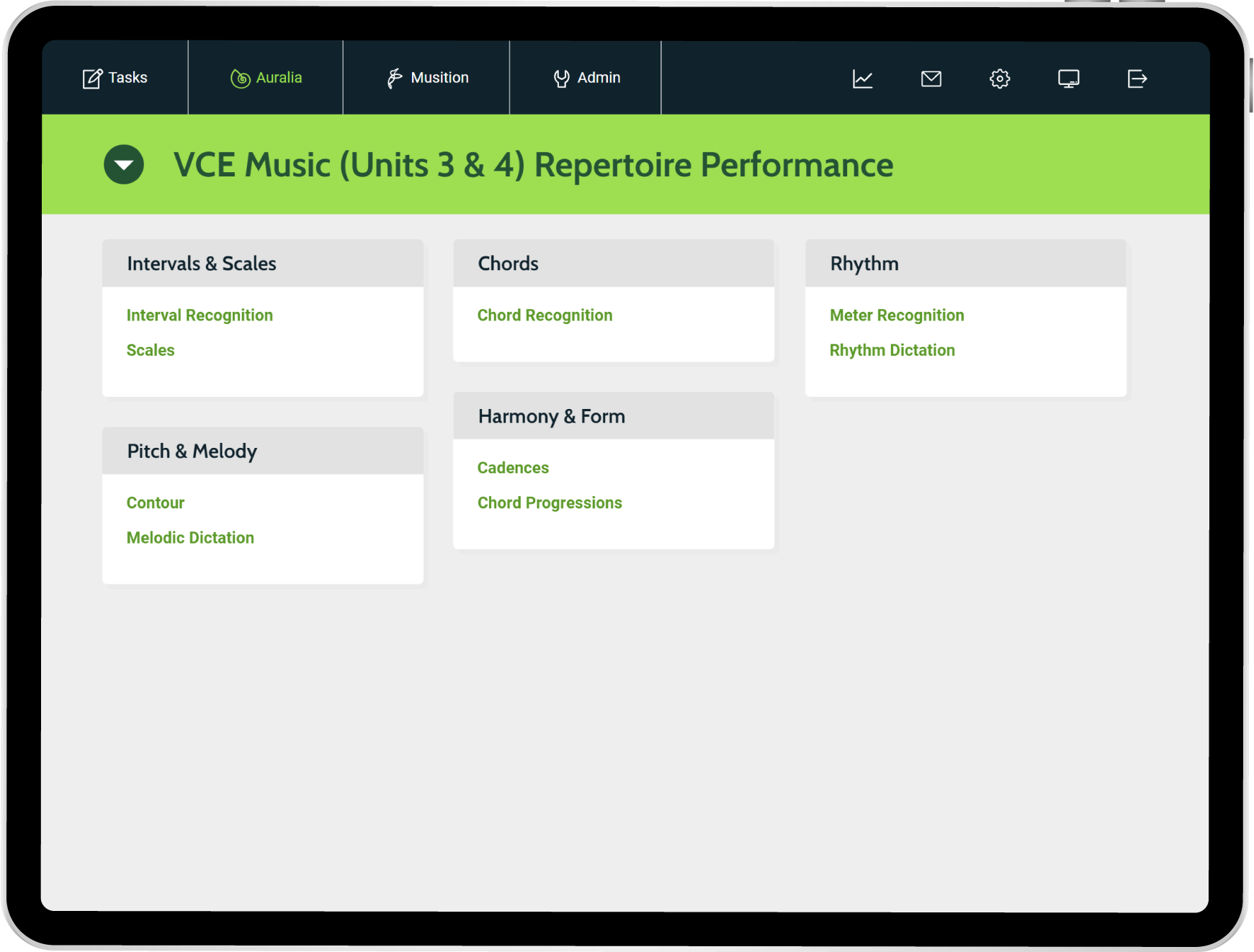 Beyond the VCE curriculum, Auralia & Musition can help your students develop all the skills they need to successfully listen, sing, compose, improvise and perform. Students will learn fundamental music skills, and link theory and aural concepts whilst engaging with music from the western classical tradition, plus pop, jazz, film and world music. The library includes searchable audio recordings and YouTube links with linked questions, and allows you to import your own materials.